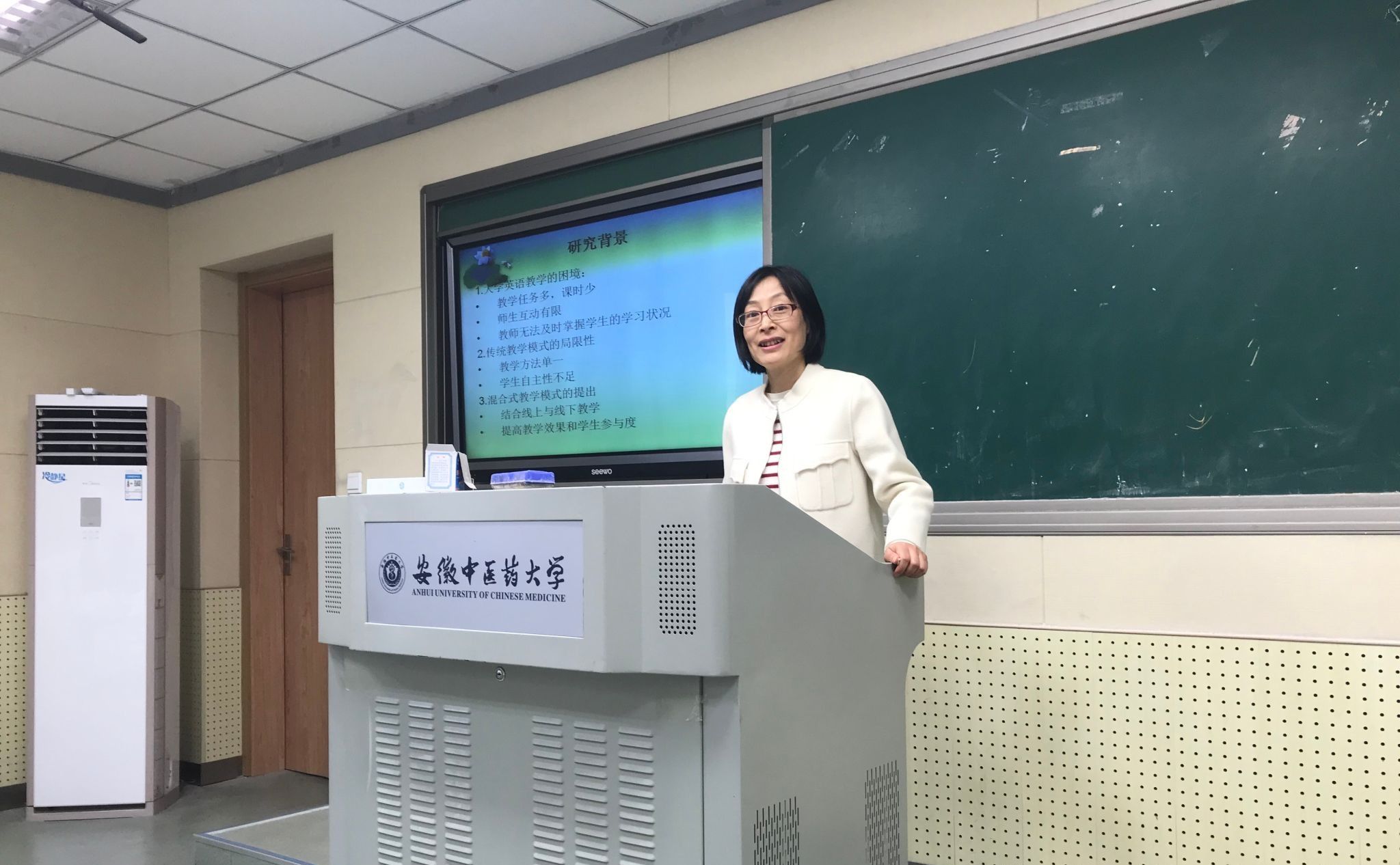 10月22日, 人文与国际教育交流学院举办了医学人文论坛第五十七期学术沙龙。本次学术沙龙的主题为“基于学习通的大学英语混合式教学模式研究”,由外语系的马勤老师主讲,外语系和传播系教师参加了本次交流活动。