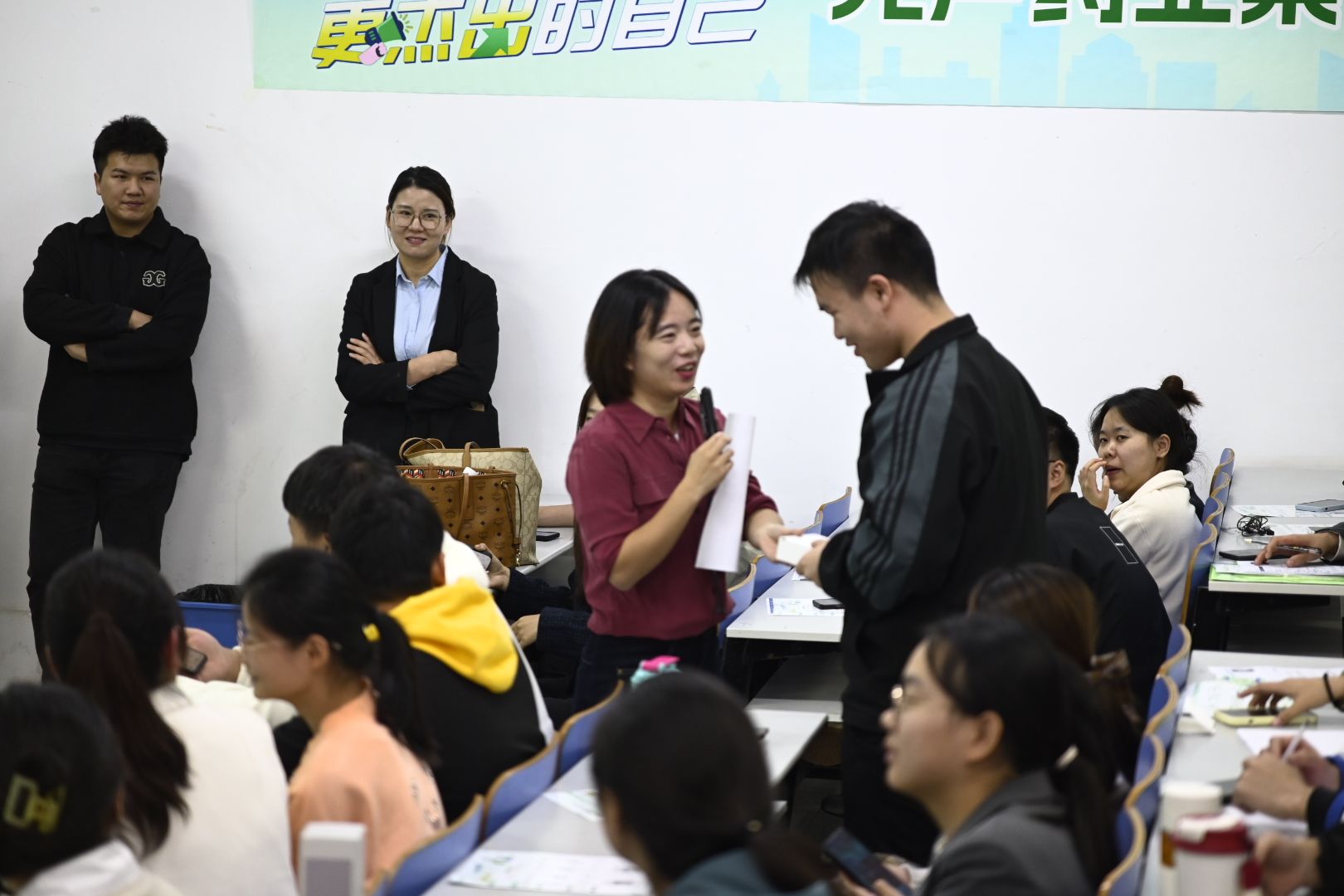 会上,杜艾为介绍了先声药业集团的企业特色、发展历程、规模、服务理念等,随后各区的经理和主管对各区的基本情况和工作的具体内容进行介绍,人力资源主管介绍了2025届校园招聘的内容和相关的薪酬待遇。最后2021届校友张舒欣分享了在先声药业集团的工作经历和工作心得。会后,同学们积极提问,问题涵盖了公司的培训体系、职业发展路径、福利待遇等各个方面,并积极投递简历。公司代表们一一耐心解答,现场气氛活跃。