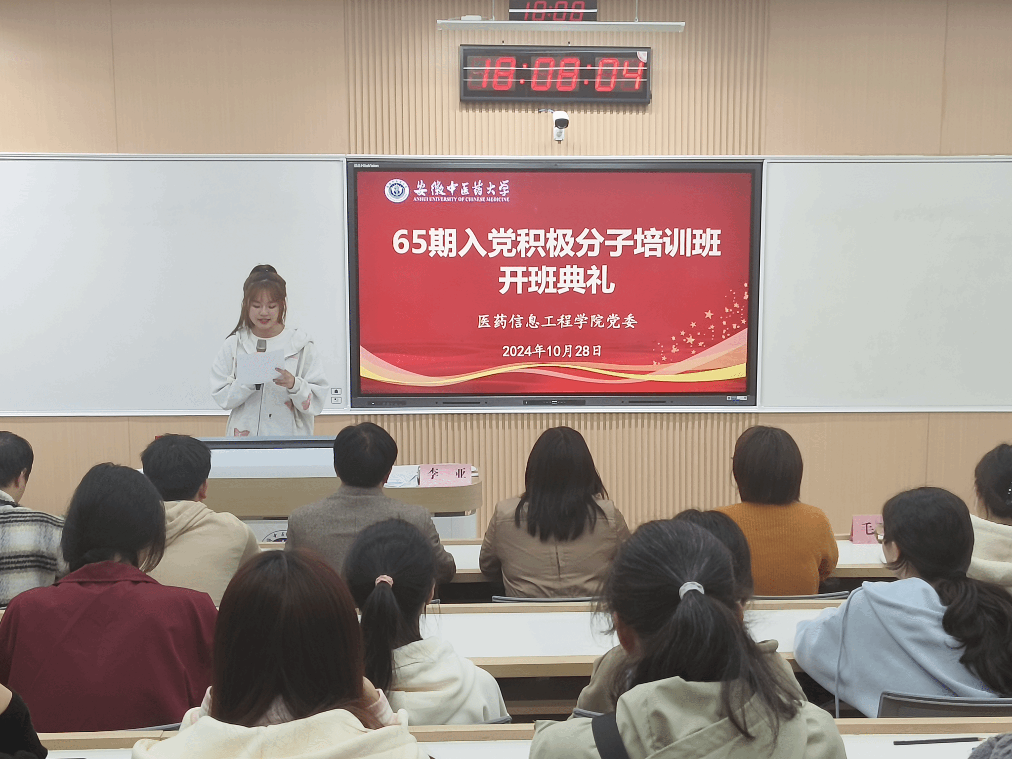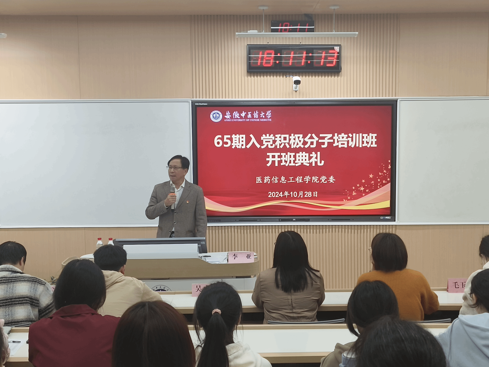 10月28日,安徽中医药大学医药信息工程学院第65期入党积极分子培训班顺利开班,学院党委书记高霞,组织员(正处级)吴成海,党委副书记、纪委书记李亚,学生党支部书记,以及本期115名学员参加本次开班典礼,典礼由李亚主持。