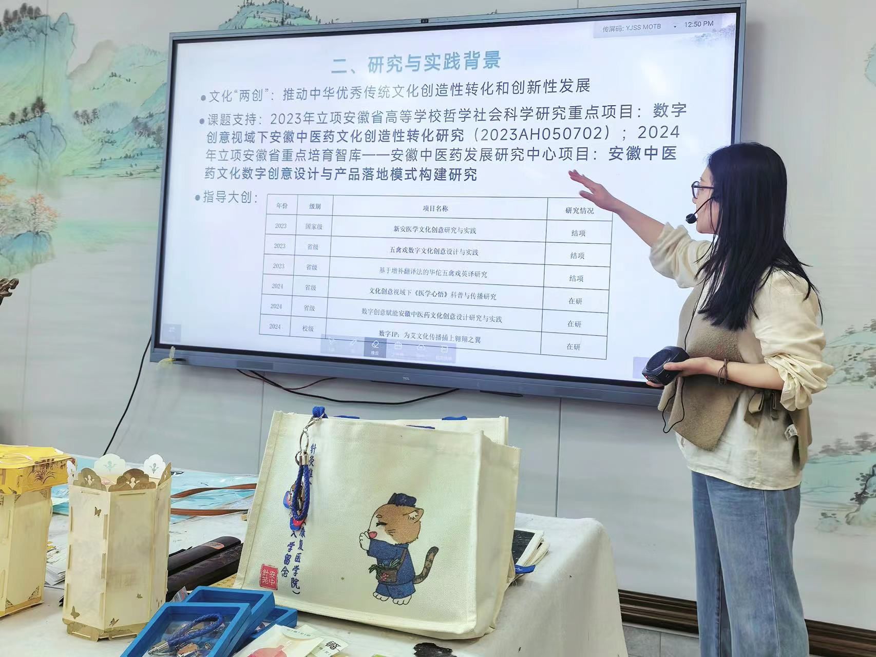 董一帆在本次讲座中辨析了文化“两创”与文化创意的关系,分析经典文创案例、传播策略及市场反馈,分享了中医药文化创意研究工作室——“心悟文创”的研究背景、作品设计与社会实践,并在会后分发了工作室师生原创的中医药文创产品,受到参会老师的好评。