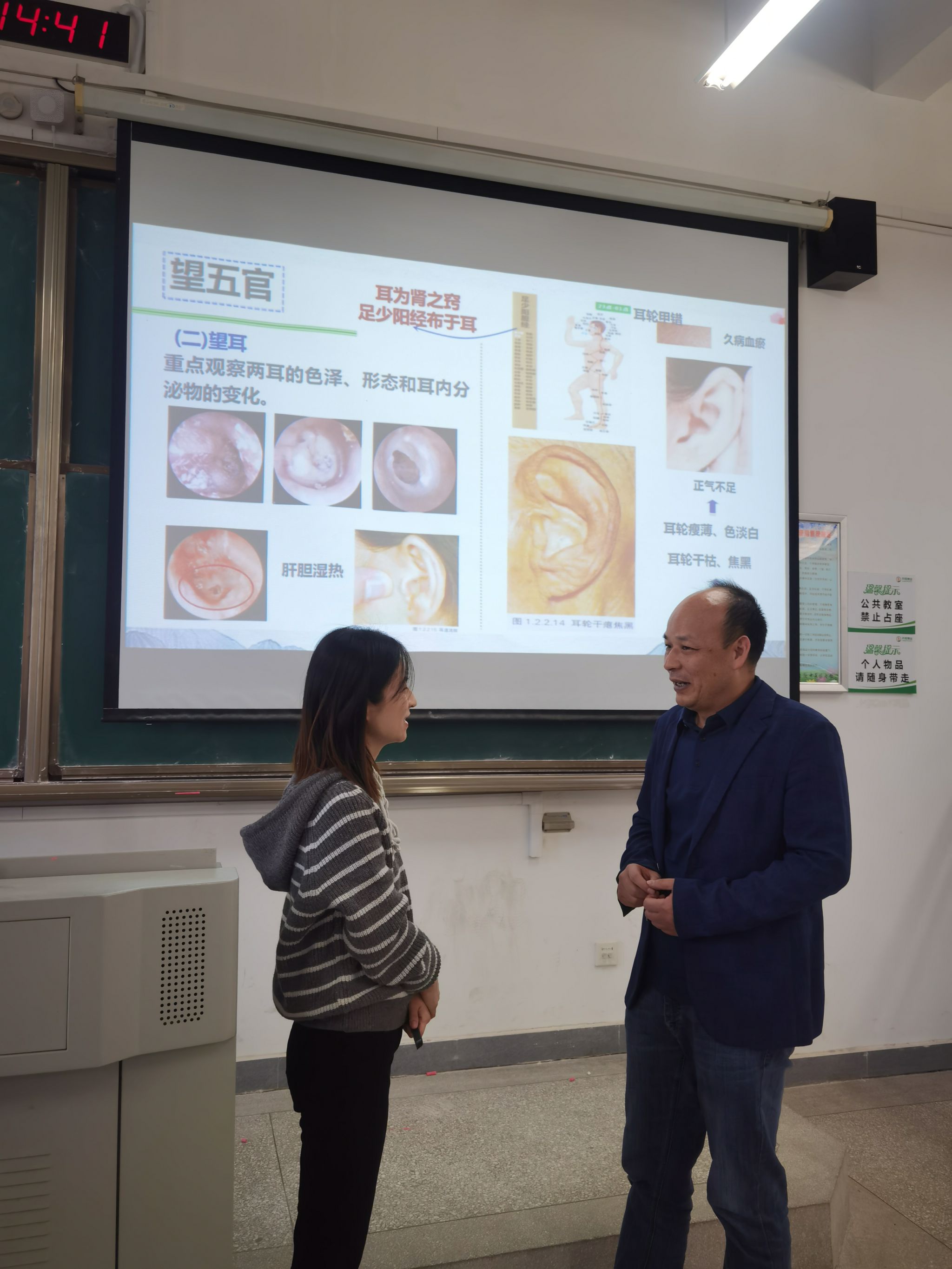 第一阶段,与会教师听取了袁亚美老师讲授《中医护理学基础》,袁老师以中医望诊为切入点,聚焦时政热点,从强健体魄、科技赋能角度巧妙引入课程思政元素。课间,林家虎教授对袁老师的授课给予高度评价,并围绕课程思政教学设计与袁亚美老师进行了交流。