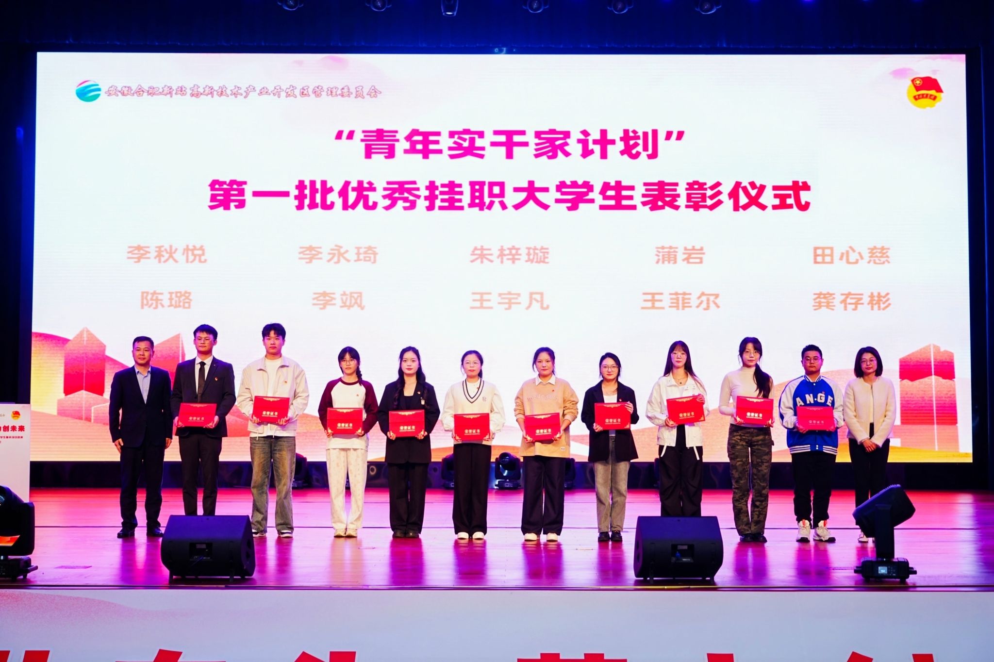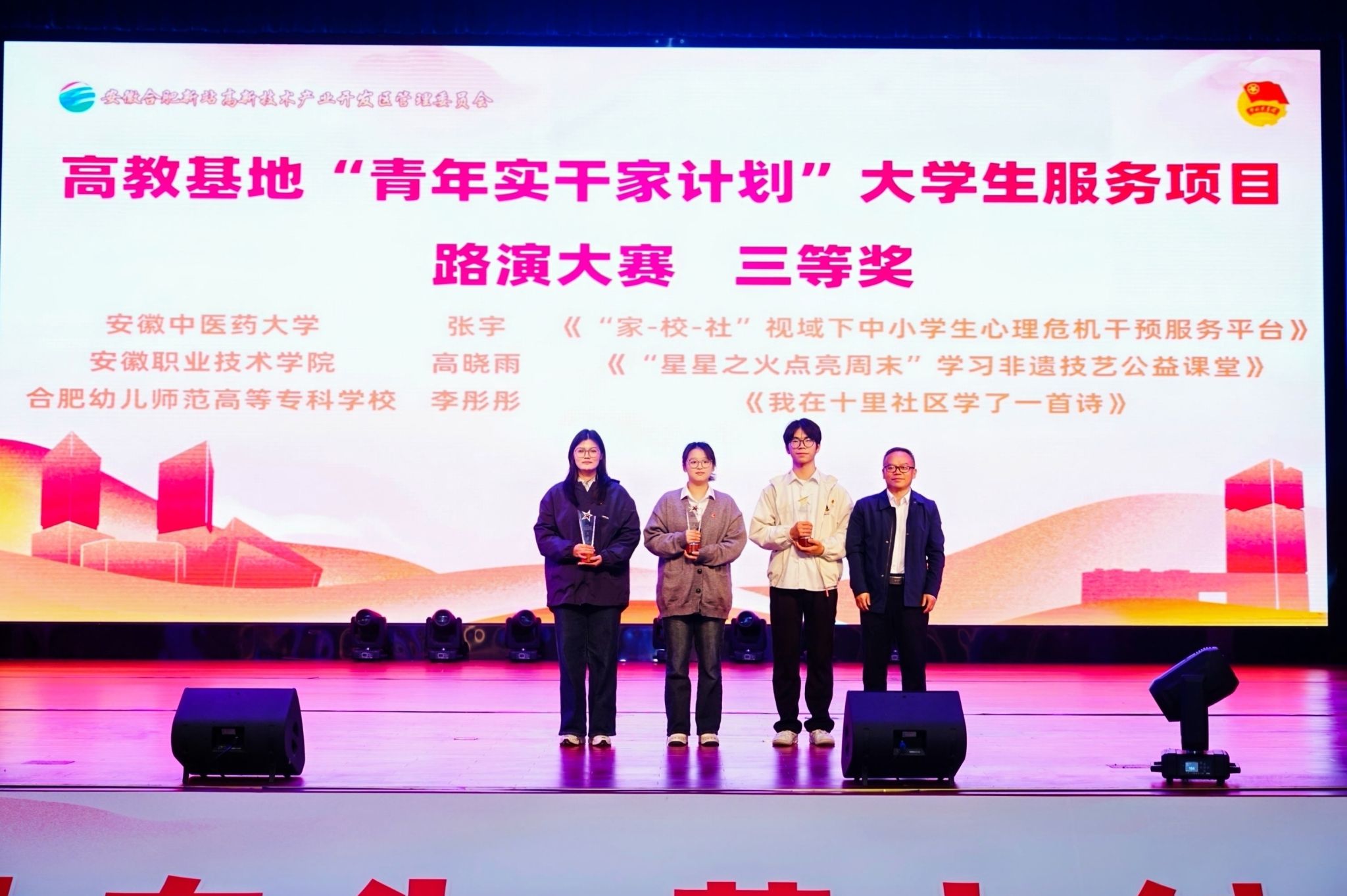 11月13日下午,新站高新区高教基地“青年实干家计划”大学生服务项目路演暨“招才引智”校园双选会在安徽职业技术学院召开。我校团委荣获新站高新区高教基地共青团工作联席会“优秀单位”、药学院2022级药物制剂2班李秋悦同学荣获“青年实干家计划”第一批优秀挂职大学生、人文与国际教育交流学院2022级应用心理学2班张宇同学荣获高教基地“青年实干家计划”大学生服务项目路演大赛三等奖。