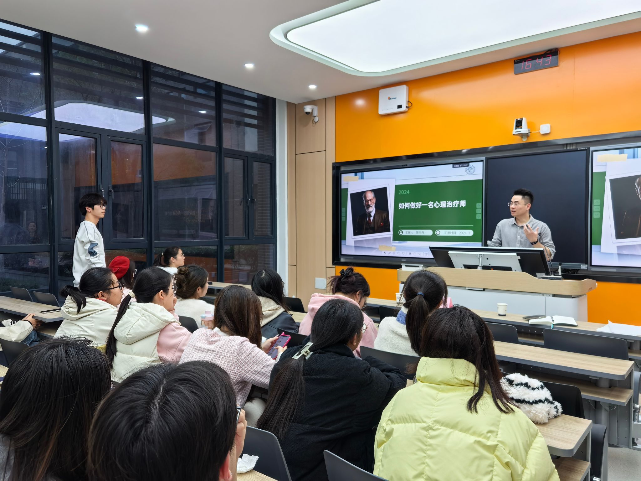 讲座过程中,胡冉冉从心理治疗师的工作内容、一名合格的心理治疗师必备的素养和技能、心理治疗师成长的四个阶段、发展前景和路径以及如何开启职业之路五个方面,从自身经历深入浅出的为同学们进行了详细的讲解。他指出随着社会对于心理健康重视程度的不断提高,心理治疗师职业前景十分广阔,并建议同学们可以从当下开始积累学习实践经验,不断提高专业水平。