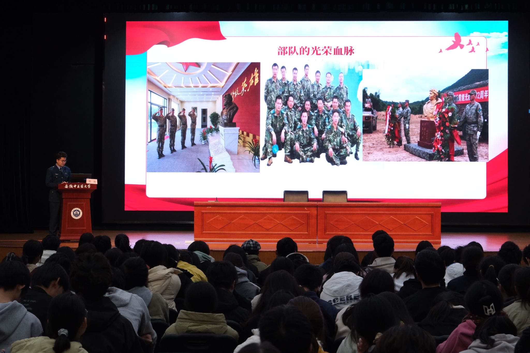 张迪则用自己的亲身经历,为新生们讲述了一段从普通大学生到优秀士兵的蜕变历程。他分享了参军入伍的初衷、军营生活的点滴以及退役复学后的感悟,鼓励同学们积极响应国家征兵入伍的号召,携笔从戎,为国家的繁荣富强贡献青春力量。