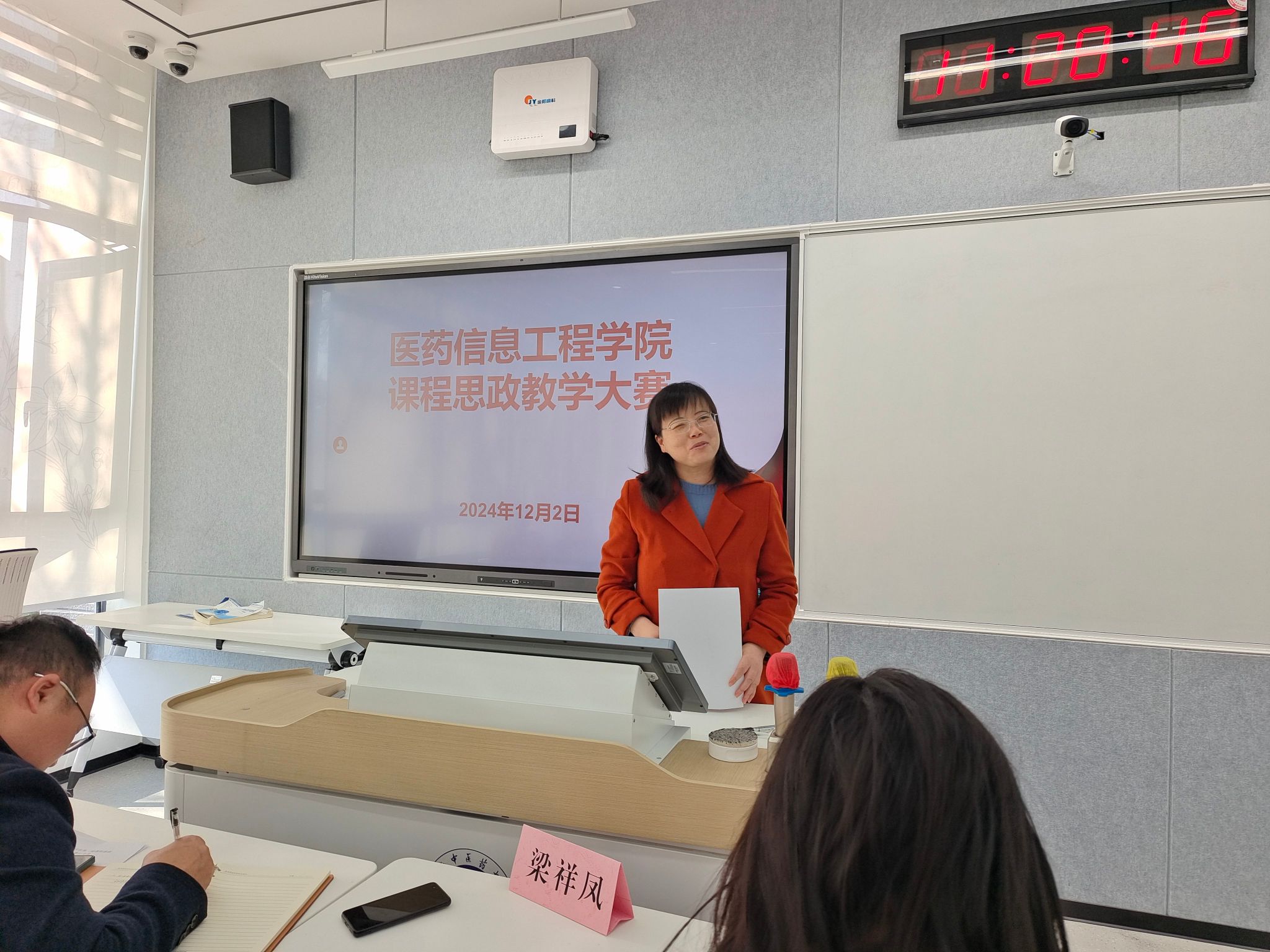 12月2日,医药信息工程学院举办第二届课程思政教学大赛,马克思主义学院梁祥凤教授到场指导,学院党委书记高霞,学院党委委员、副院长阚峻岭及各系主任,学院教学督导担任评委,学院全体教师观摩了比赛。