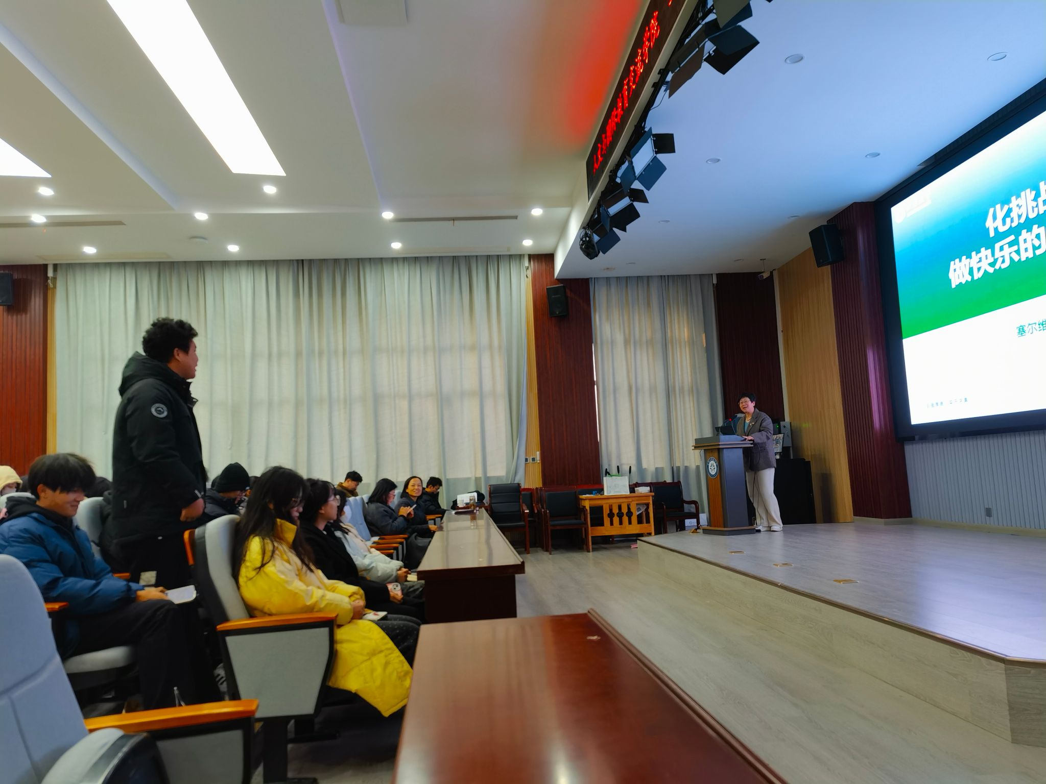 在下午的专题讲座中,高静为汉语国际教育专业学生作题为《化挑战为机遇,做快乐的Global Player》的主旨演讲,她分享了带领团队白手起家建设塞尔维亚尼什大学孔子学院的历程,介绍了团队为提升中文在塞尔维亚的国际传播和影响力所做的努力和取得的成效;她鼓励学生要从积累知识、学会学习、擅长处理人际关系与他人合作、不断提升国际视野、知晓自己之于组织和社会的价值等五个方面努力,成为快乐的国际玩家。高静院长声情并茂的演讲极具感染力,让同学们深受启发,很多同学在讲座后都给高静院长发了感谢的信息,表示“通过高静院长的分享,开拓了眼界,了解了孔子学院和汉语国际传播到底可以做什么、如何做,深受启发,坚定了未来传播汉语的信心。”