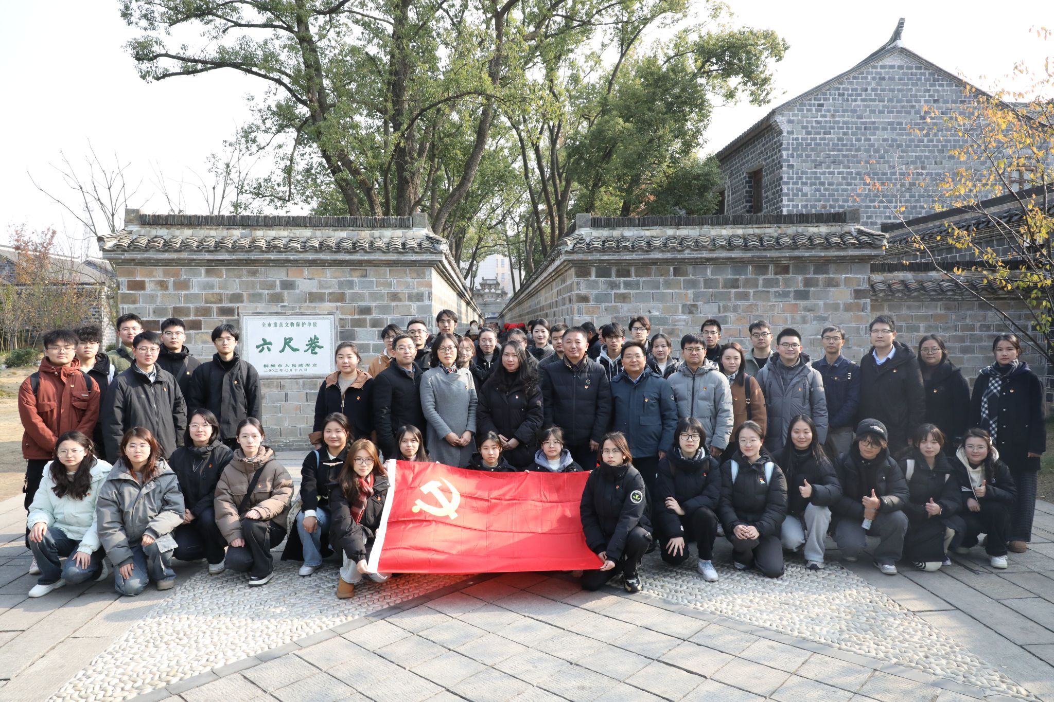 12月13日,第一临床医学院组织部分基层党支部及全体团学干部赴桐城市六尺巷开展党建带团建研学活动,并与桐城市情系爱心联合会签订大学生社会实践基地合作协议。学院党委副书记宋婷婷、共青团桐城市委书记倪晋明、桐城市卫生健康委副主任叶风利、情系爱心联合会党支部书记项玉、会长李文共同为基地签约及揭牌,学院宣传统战部、团委、临床教学部、实习科、就业科负责人及学生代表参加此次活动。