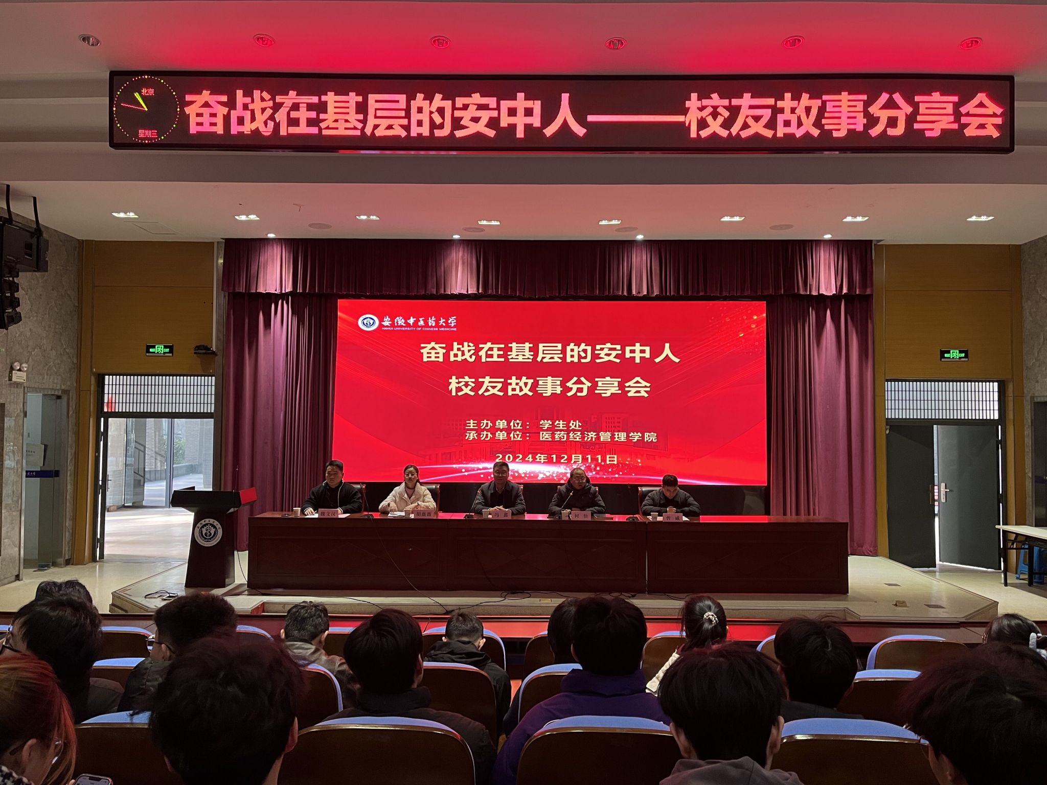 12月11日,由学生处主办,医药经济管理学院承办的“奋战在基层的安中人”校友故事分享会于至诚楼A114教室举行,分享会邀请四位校友返校交流,300多名在校生参与活动。
