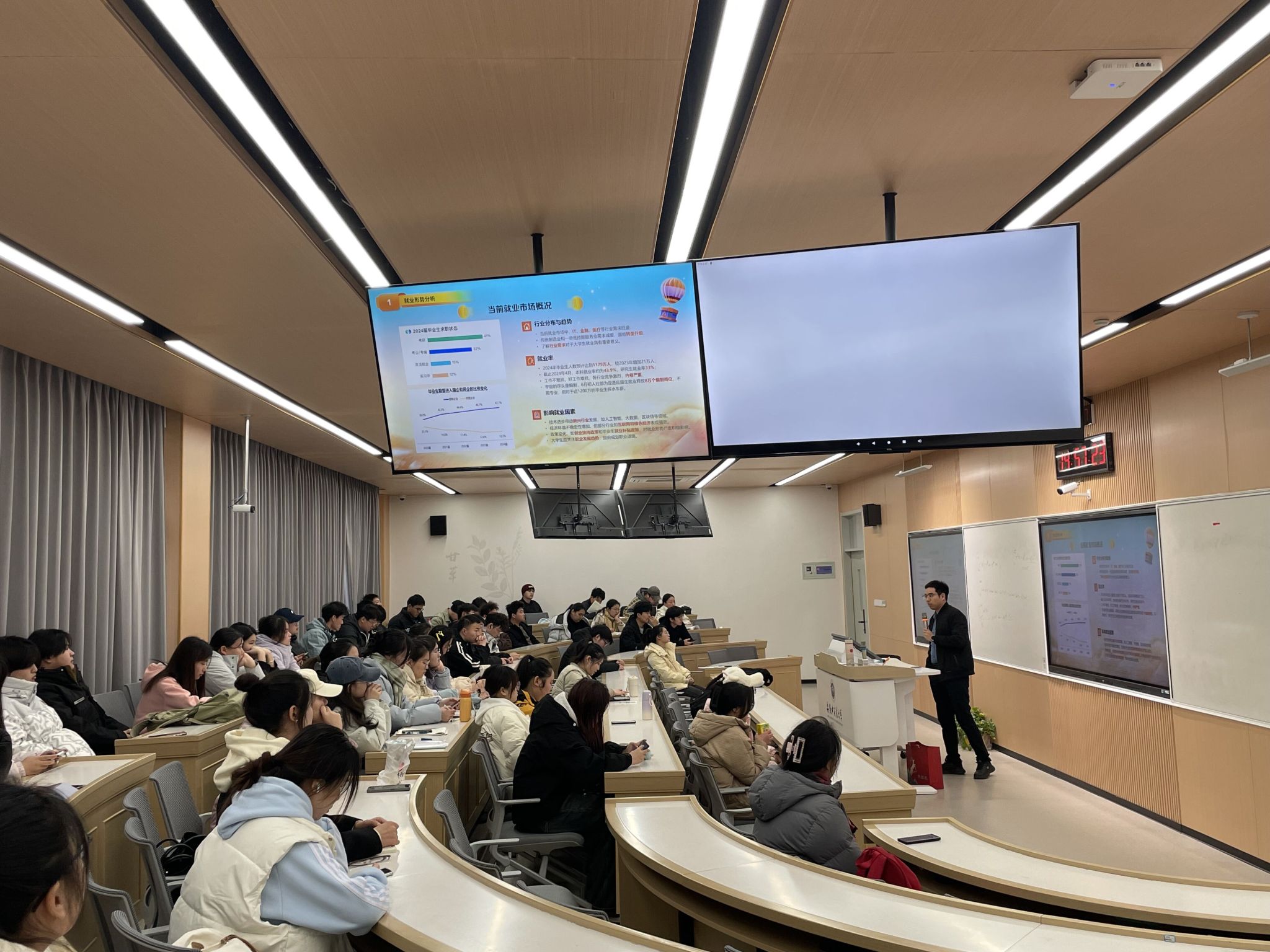 会上,徐晓峰以“从学校到职场的转型之路”为主题从就业形势分析、心动的OFFER、摆脱学生思维、职场小秘籍四个方面进行分享。引导学生了解当前的就业市场概况、掌握简历制作的方法和面试准备与应对、学会身份的转变以及成为优秀的职场达人的建议。同学们围绕就业选择、就业方向以及就业形式等方面提出了问题,徐晓峰热情地为同学们答疑解惑,并提供建议。