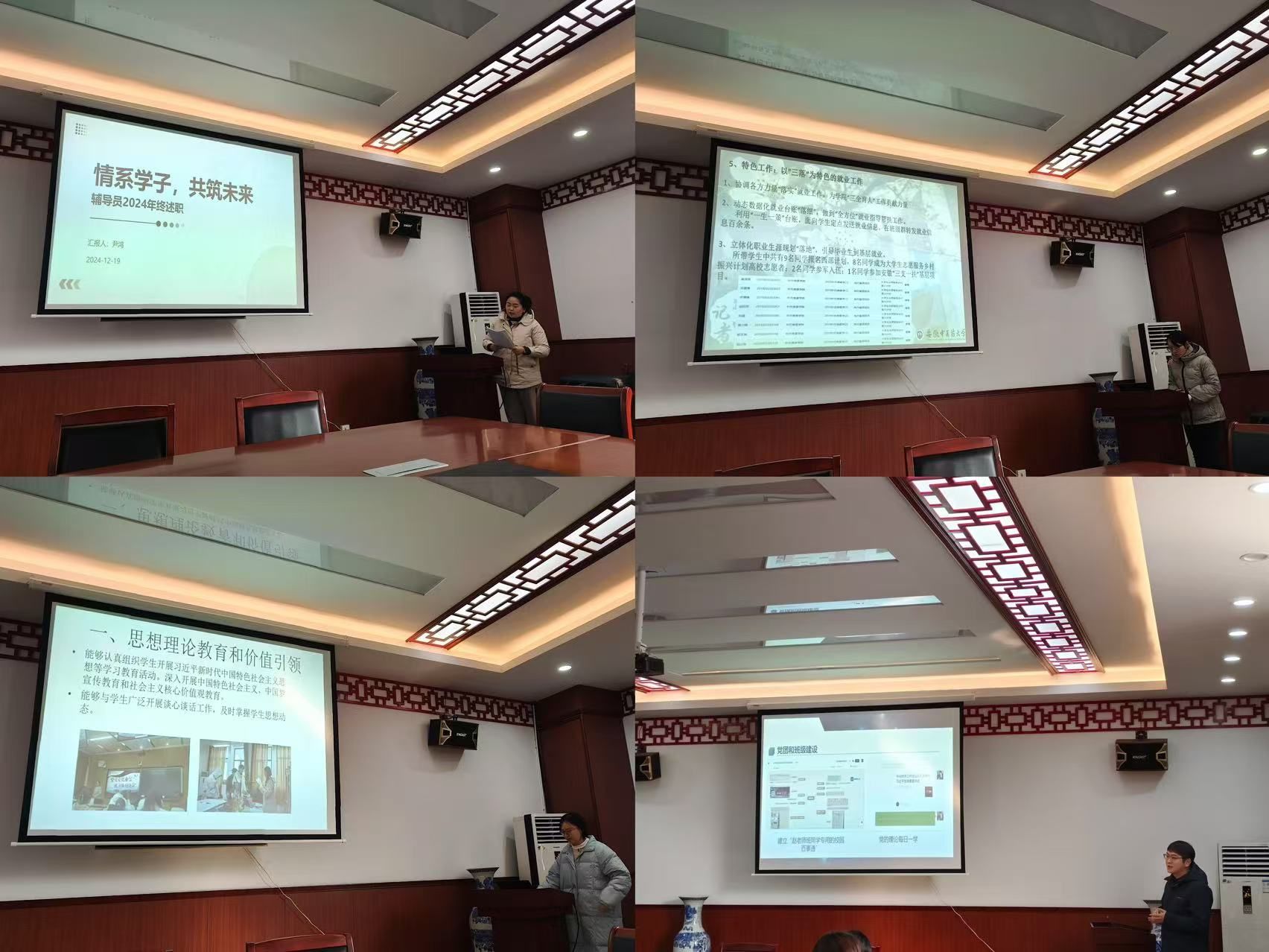 各位辅导员老师通过现场述职,详细汇报了2024年度岗位工作情况,对学生管理、思想政治教育以及危机事件的应对处置等相关工作进行了梳理与总结,交流分享了工作中的所得所感,深入探讨了工作中面临的困难与问题,并积极思索寻求解决之道。