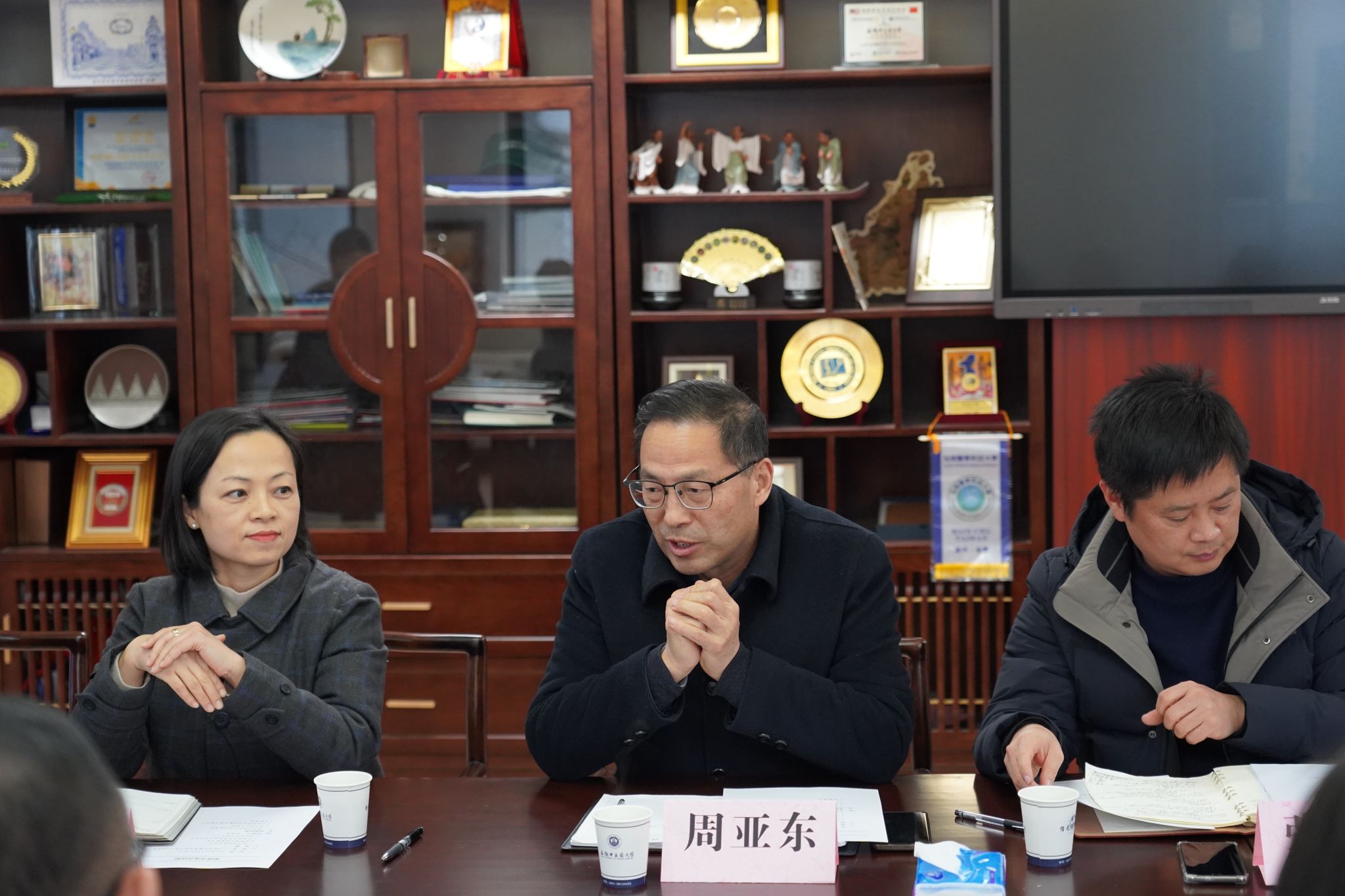 学院院长周亚东对陈军一行来学院调研表示了欢迎,并介绍了我校在中医药文化方面的优势、研究领域及近年取得的代表性成果。他表示,前期我校与安徽科技出版社有着深厚的合作基础,当前安徽省委省政府高度重视中医药工作,着力推动中医药与文化、旅游等行业产业深度融合,期待通过加强学校与出版社的交流合作,将学校的优秀科研成果、教学成果、资源优势通过出版物、融媒体作品及文旅项目等形式推广开来,推动中医药文化的传播和科研成果的转化。