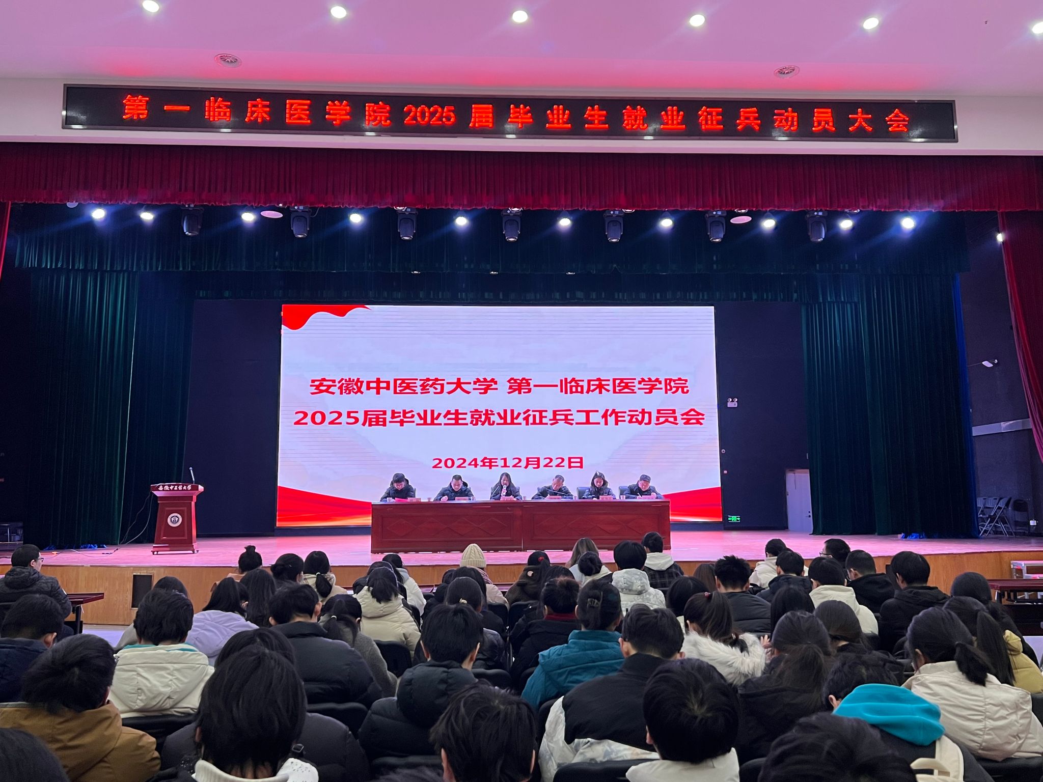 12月22日,第一临床医学院召开2025届毕业生就业征兵工作动员大会,学校学生处副处长詹钟华,学院党委副书记宋婷婷,2025届毕业生和全体毕业班辅导员参加会议,会议由学院就业科科长主持。