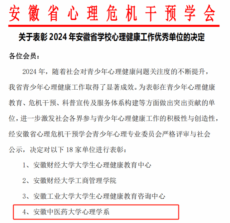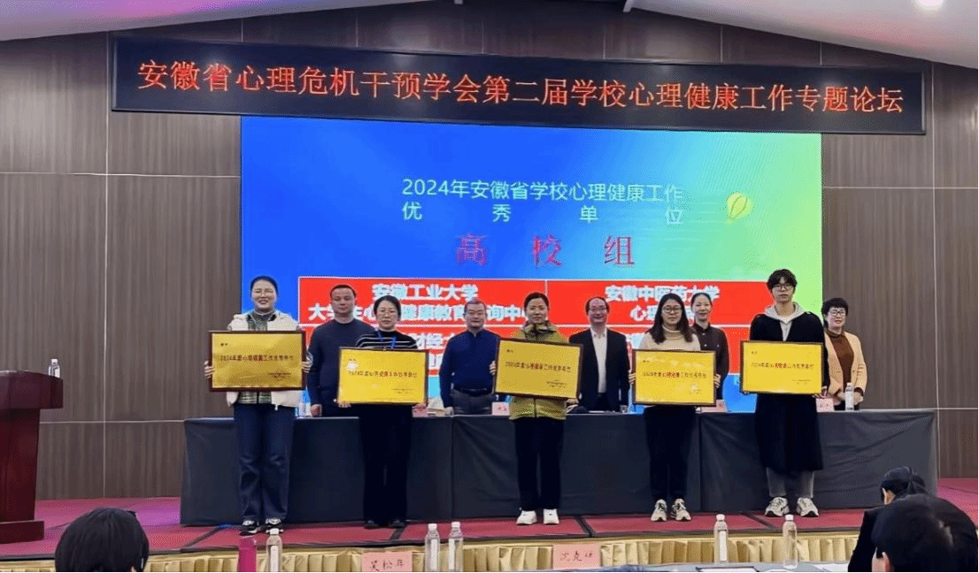 12月21日至22日,安徽省心理危机干预学会2024学术年会暨心理危机干预技能专题培训在合肥召开。会上,我校心理学系荣获“2024年度安徽省学校心理健康工作优秀单位”荣誉称号,许胜老师荣获“2024年度学校心理健康工作优秀个人”荣誉称号。