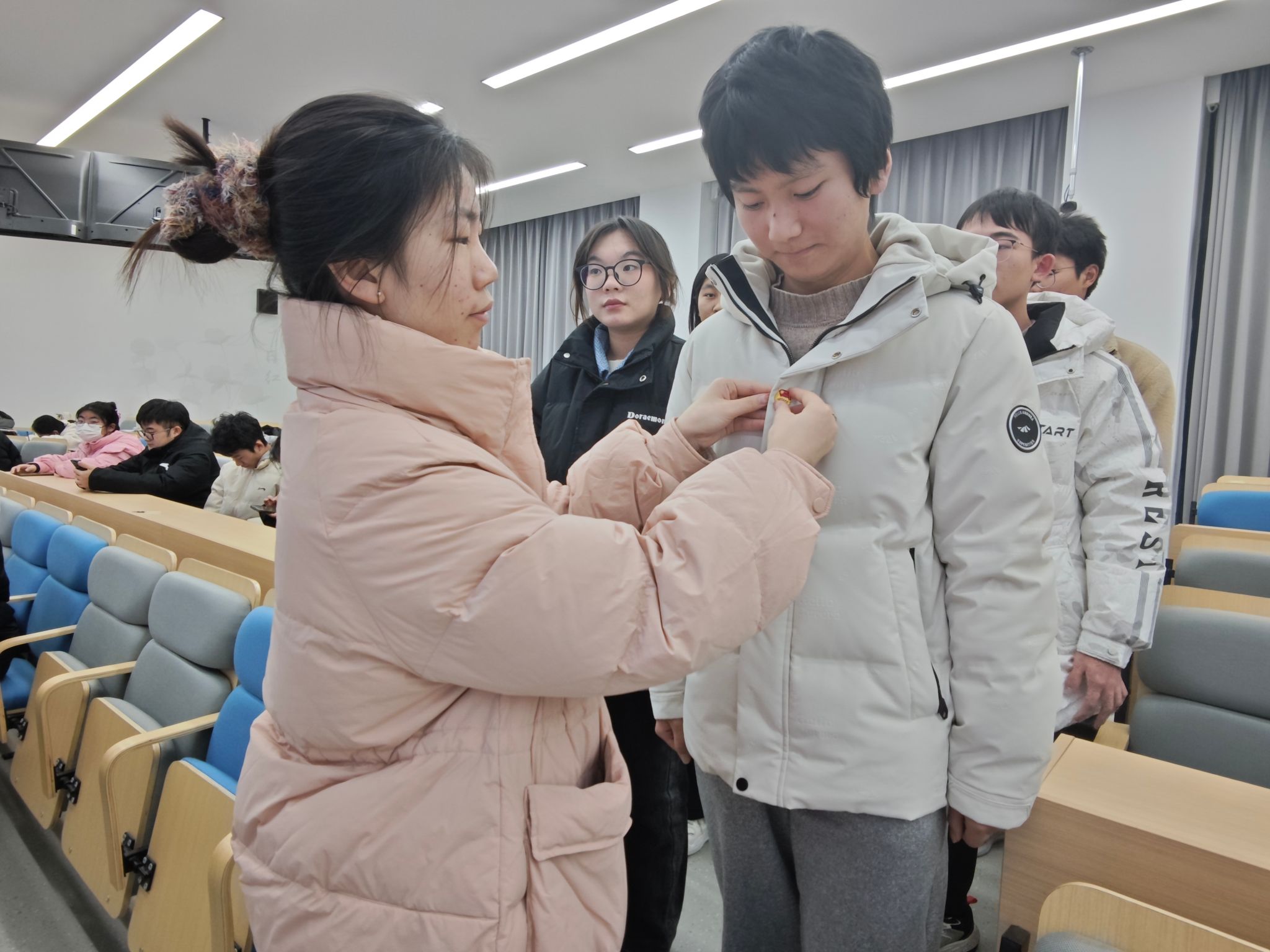 活动在庄严的国歌声中拉开序幕。学院分团委挂职副书记王雷雨首先宣读了新团员名单,高年级优秀团员代表为47名新团员代表佩戴团徽。团徽在灯光的照射下熠熠生辉,象征着作为一名共青团员的光荣和自豪,也提醒学生团员们牢记团员身份,珍惜荣誉,在今后的学习生活中不负组织信任,发挥先锋模范作用。
