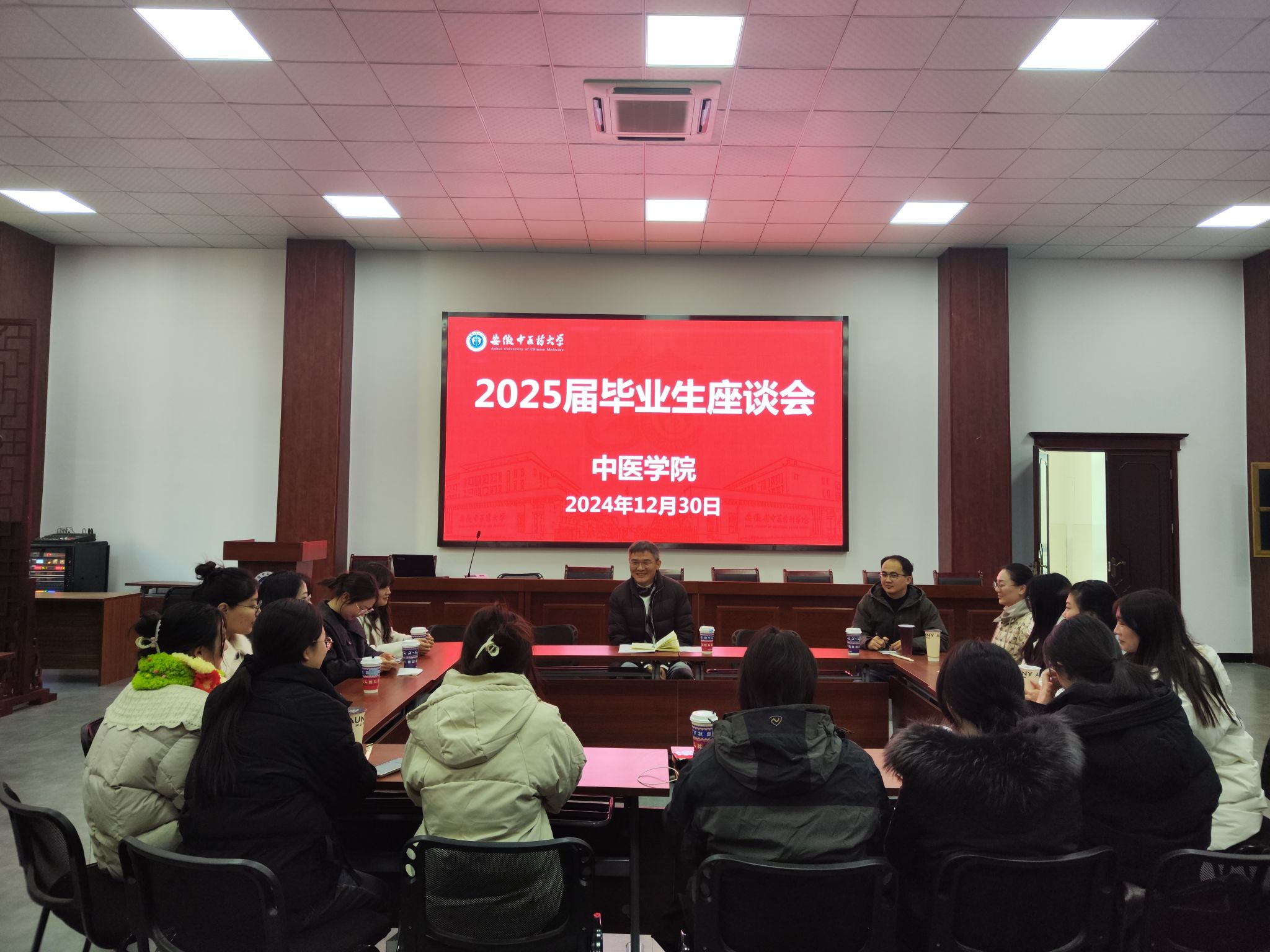 为持续贯彻落实习近平总书记在中共中央政治局第十四次集体学习时的重要讲话精神,进一步促进高质量充分就业落到实处,12月30日下午,中医学院召开2025届毕业生“书记面对面”座谈会,学院党委书记方晓主持座谈,毕业班辅导员及部分毕业研究生参会。