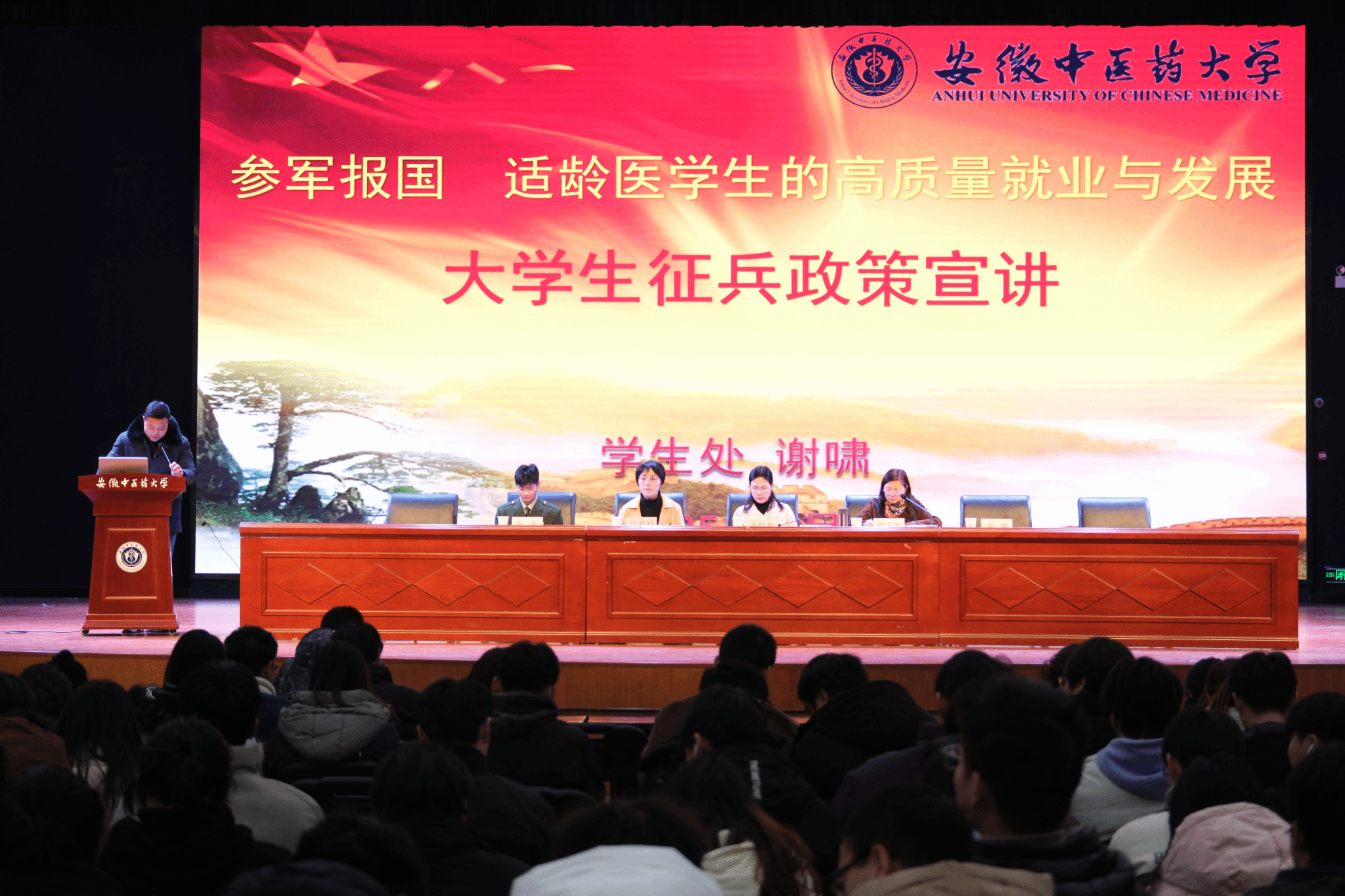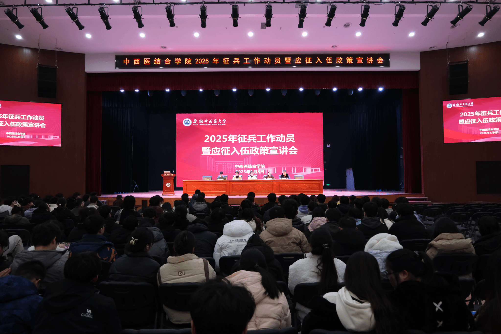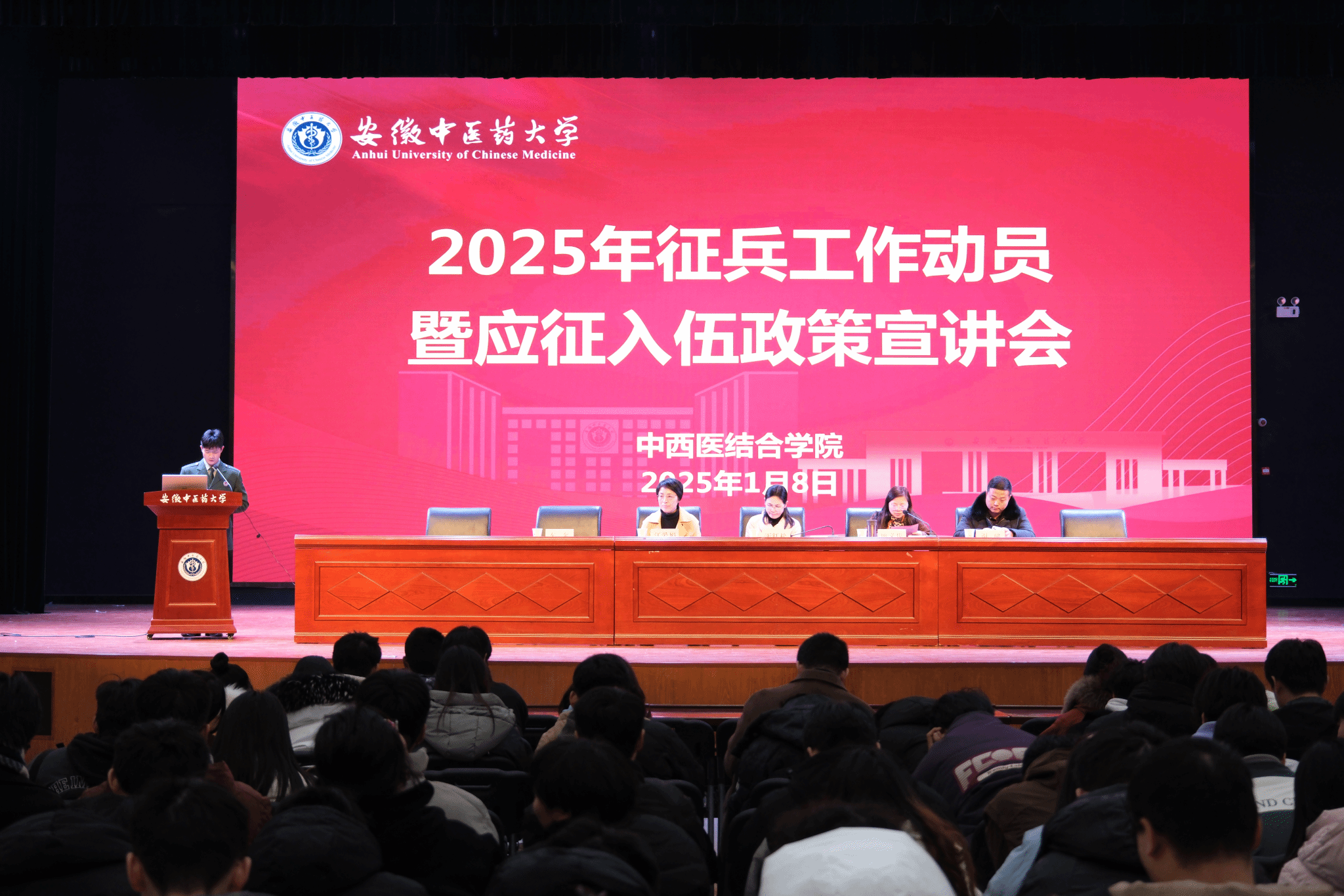 为进一步做好毕业生征兵工作,1月8日下午,中西医结合学院在大学生活动中心召开2025年征兵工作动员暨应征入伍政策宣讲会。学院党委书记王红松、党委副书记顾义俊、副院长江爱娟、2021级和2020级辅导员及学生参加会议。会议邀请学校学生处就业信息科科长谢啸、校征兵工作站站长车奔(退役大学生)进行政策宣讲,顾义俊主持会议。