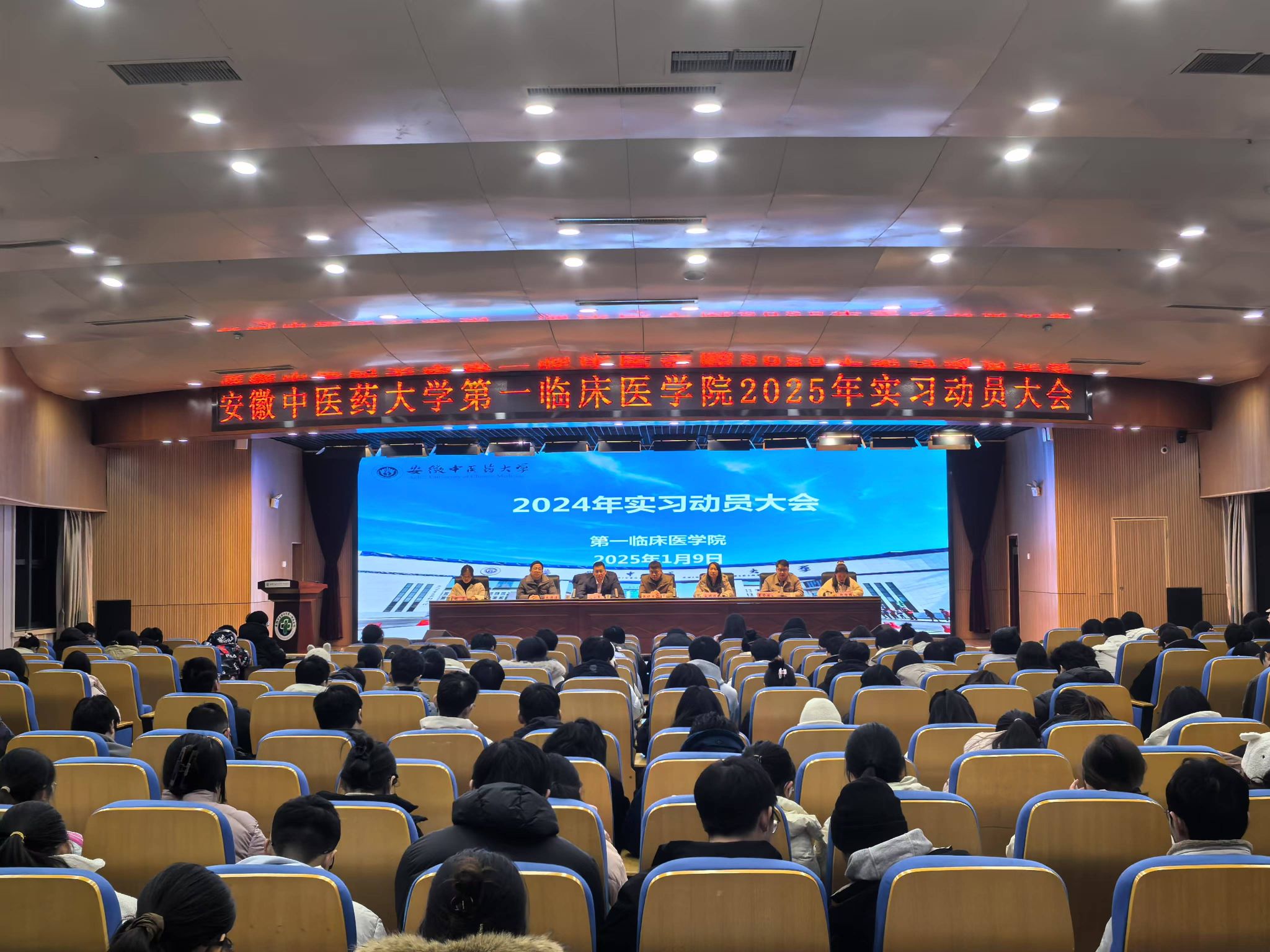 1月9日晚,第一临床医学院在学术报告厅召开2025年实习动员大会,学校教务处副处长张晓军出席会议,医院党委副书记宋婷婷,副院长沈安鲁,相关科室负责人、学生辅导员、临床教学部老师及2021级全体本科生实习生参加会议。会议由沈安鲁主持。