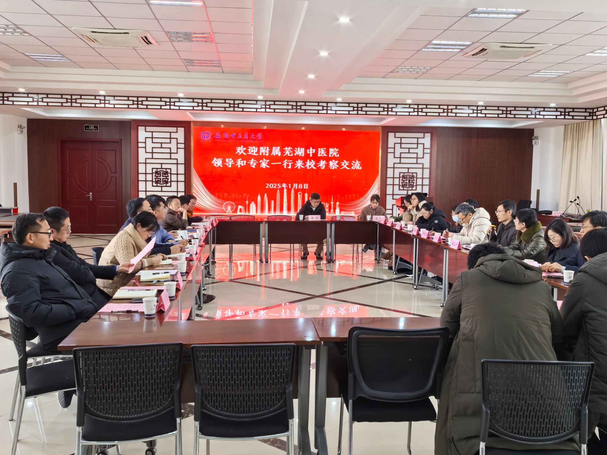 孙道礼对附属芜湖中医院一行的到来表示热烈欢迎,并简要介绍了学校当前“双一流”建设发展取得的成效。他指出,安徽中医药大学与附属芜湖中医院有着良好的合作基础,希望双方密切在人才培养、科研合作、学术交流等方面的合作,优势互补,合作共赢,共同推动中医药事业的发展。
