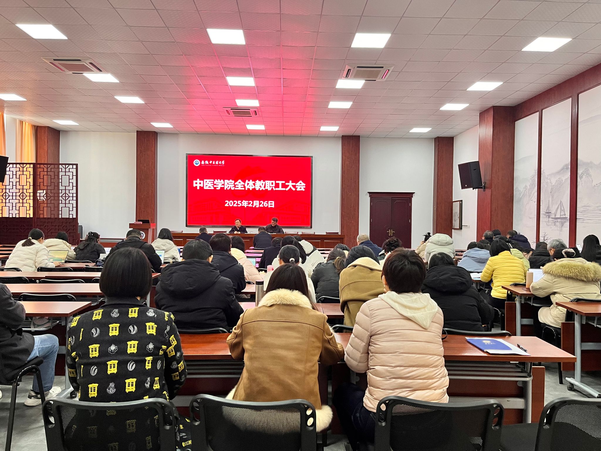 2月26日,中医学院召开2025年新学期首次全体教职工大会,部署安排新学期工作。学院党政领导班子成员出席会议,全体教职工参加会议,会议由学院党委书记方晓主持。