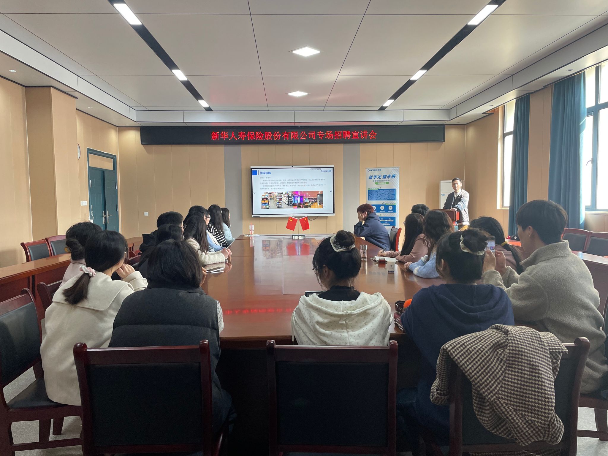 2月28日下午,新华人寿保险股份有限公司总公司运营作业中心核保作业处(合肥)一般负责人韦伟、核赔作业岗施建凯、陈亚楠一行到中西医结合学院开展专场招聘宣讲会,学院党委副书记顾义俊、就业秘书和2025届毕业生代表参会。