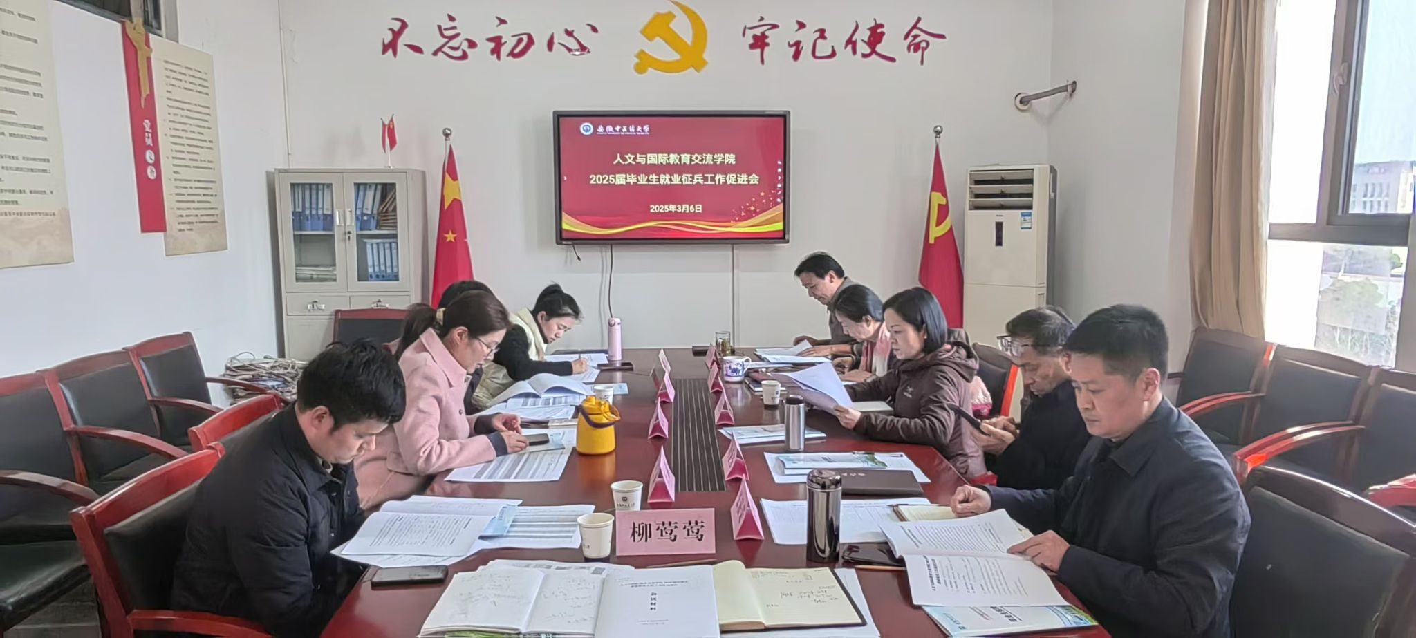 3月6日,人文与国际教育交流学院召开2025届毕业生就业工作促进会。学院领导班子,汉教系、心理系主任,实习就业办公室主任,毕业班辅导员参加会议。会议由学院党总支副书记彭青和主持。