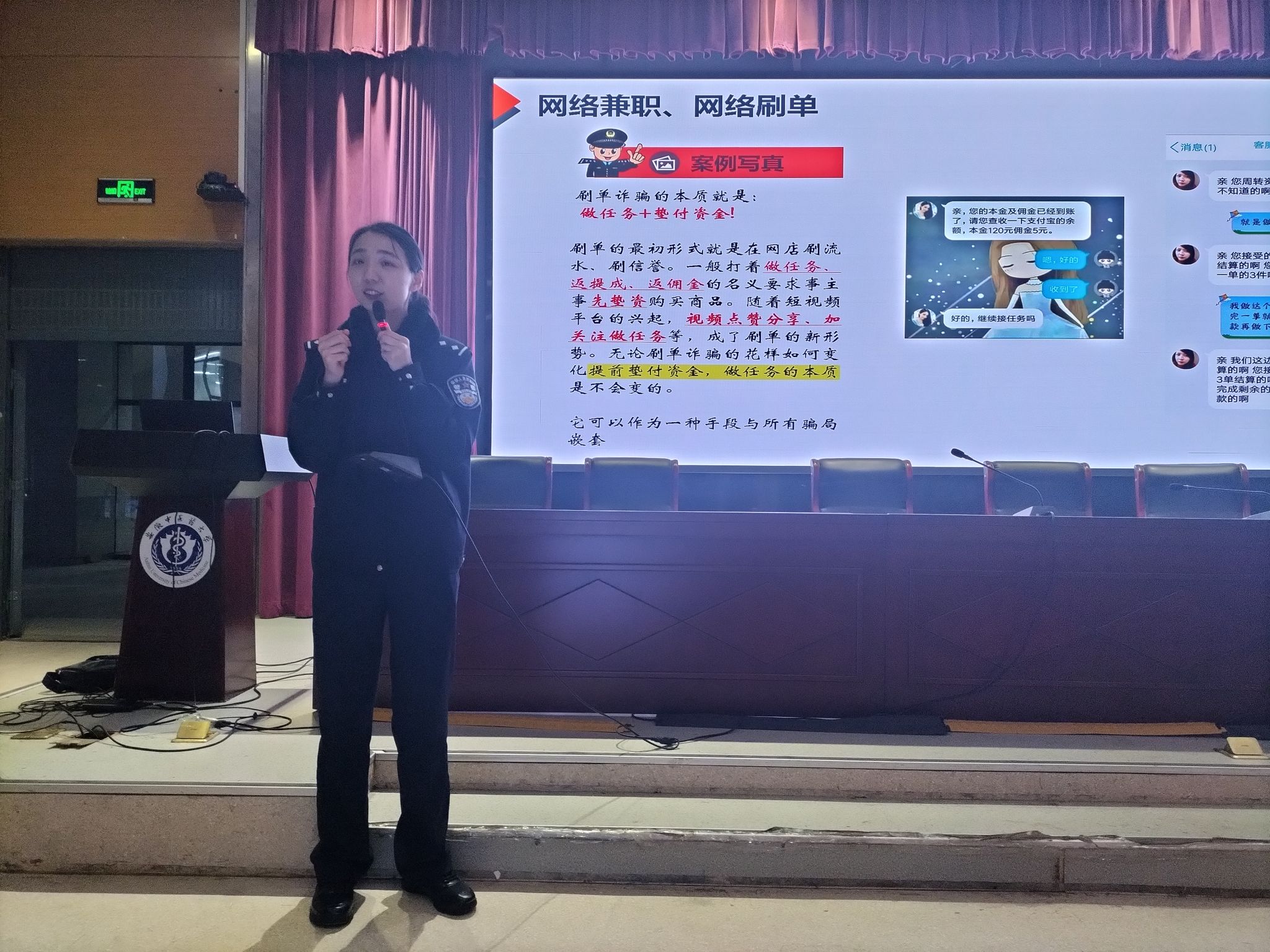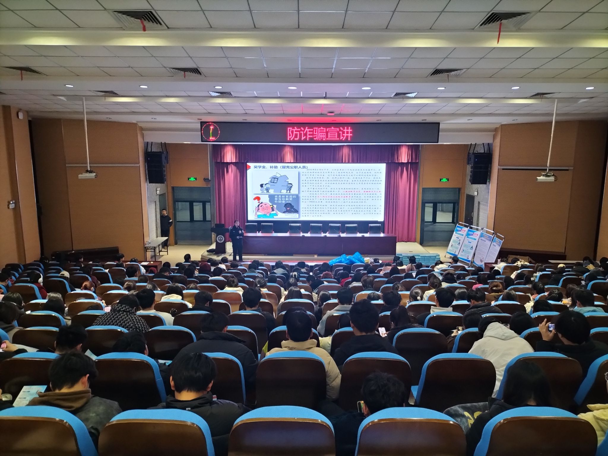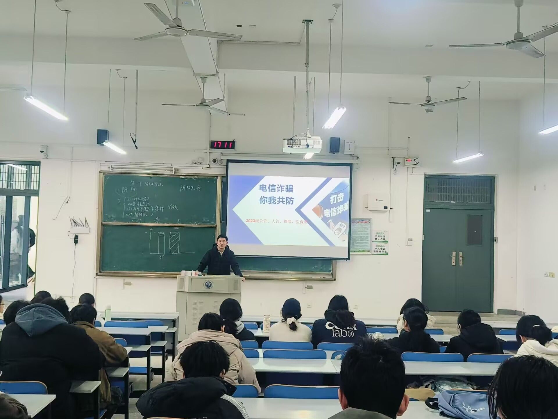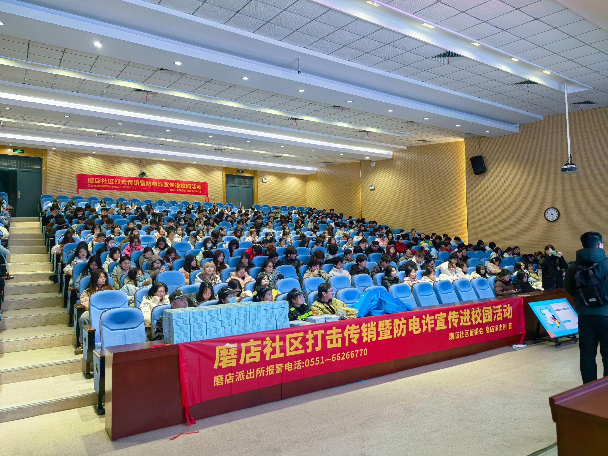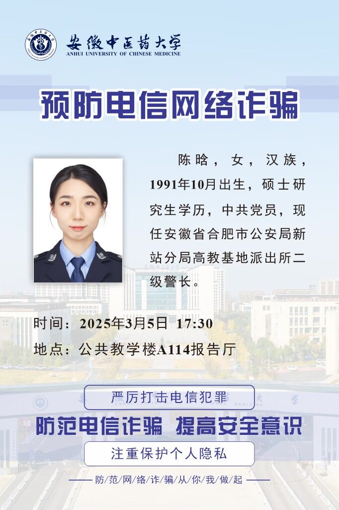 同时,学院联合磨店社区,特别邀请了磨店派出所的反诈专家陈晗警官为全院师生举办了一场防电诈专题讲座,讲座现场气氛热烈,师生们认真聆听,积极互动。专家结合近年来发生的典型案例,深入剖析了电信诈骗的特点和危害,并详细讲解了如何识别和应对各类诈骗手段,通过实际案例讲解,提高同学们预防诈骗的能力。