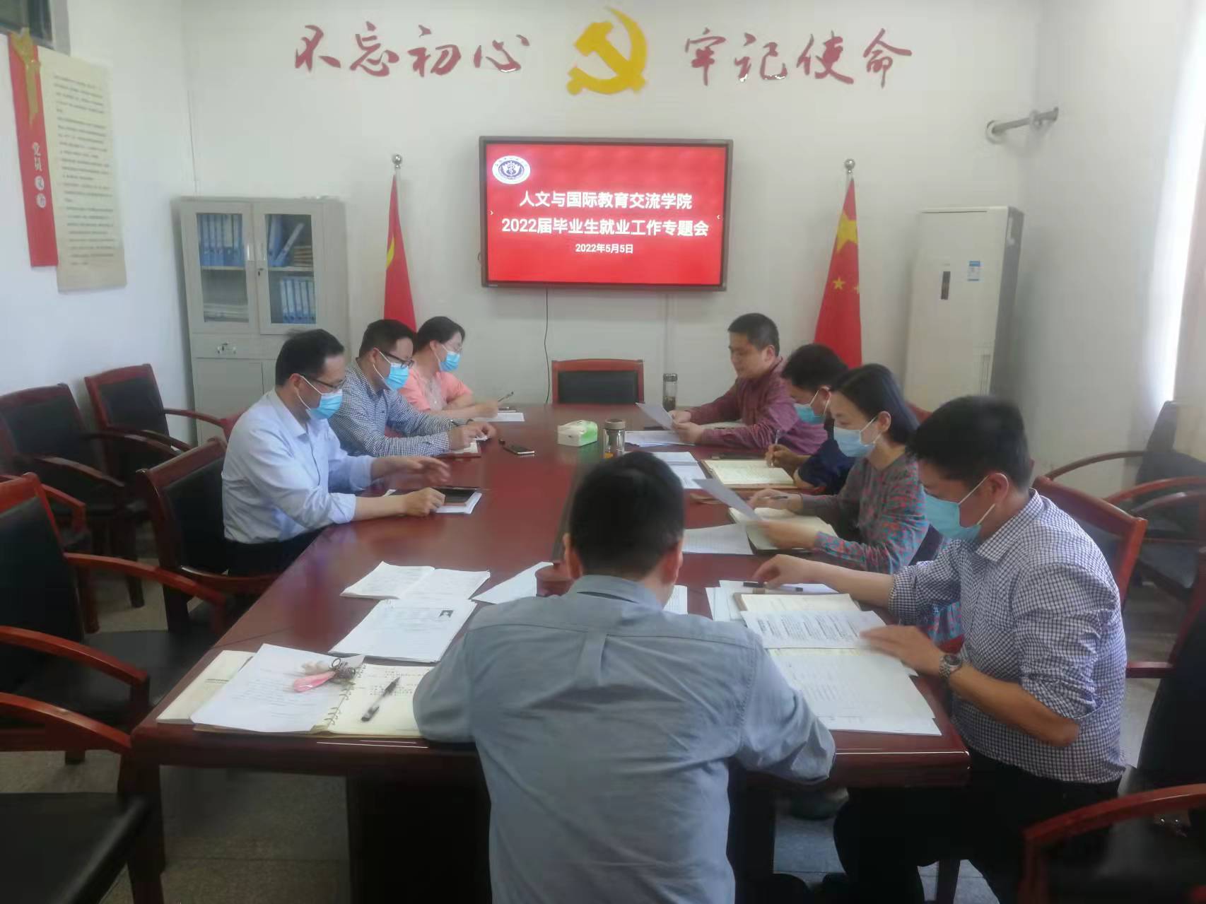 为促进2022届毕业生高质量就业,5月5日下午,人文与国际教育交流学院召开毕业生就业工作专题会,学院全体党政领导班子,实习就业办秘书及毕业班辅导员出席了此次会议。