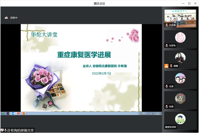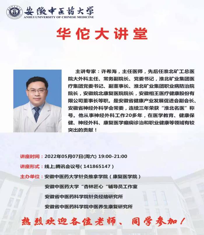 5月7日晚,针灸推拿学院(康复医学院)举办第五期“华佗大讲堂”,邀请淮北矿业集团医疗集团党委书记、安徽皖北康复医院院长、安徽相王医疗健康股份有限公司董事长、学院外聘就业导师许希海以《重症康复医学进展》为题开展线上讲座。学院党政领导、“杏林匠心”工作室全体辅导员、“全国党建工作样板支部”教工第一党支部党员、学院师生近200人参加了本次讲座。会议由学院院长唐巍主持。