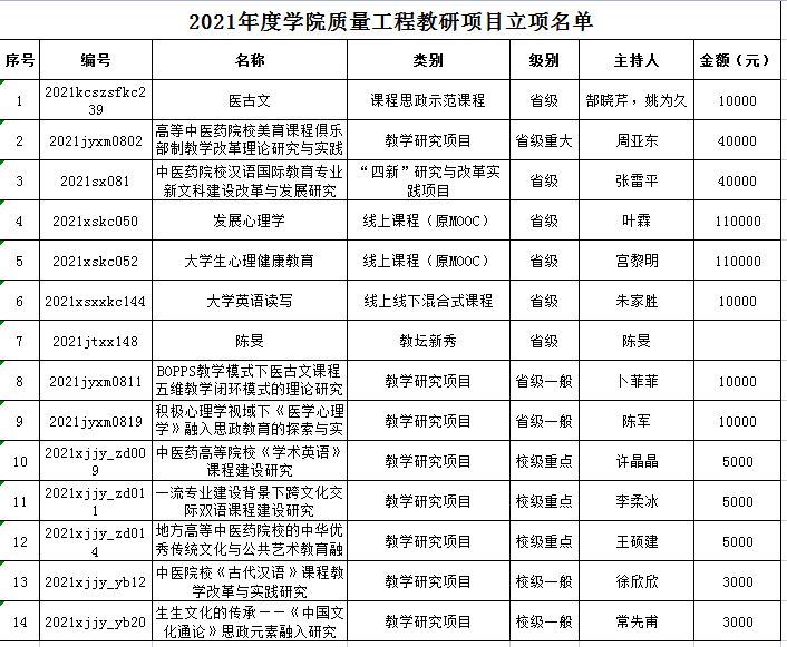 在近期下发的2021年省级校级质量工程及教研项目文件中,人文与国际教育交流学院共有14项课题获批,创历年新高。