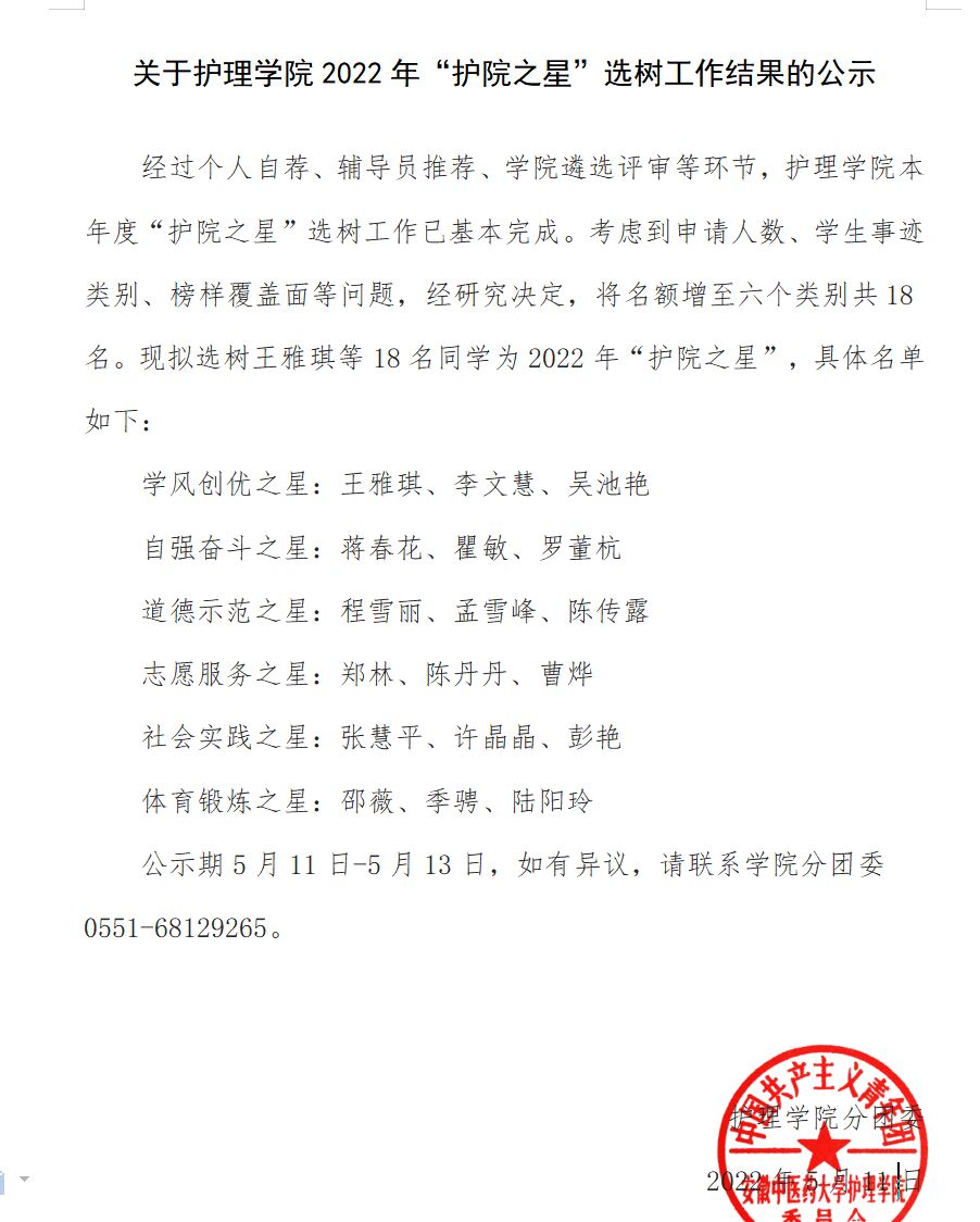 目前,经个人自荐、辅导员推荐、学院遴选评审、公示等环节,此项工作已基本完成。拟选树王雅琪等18名同学为2022年“护院之星”。后续,将持续推送18名同学的个人事迹,加强典型宣传,树立学生榜样。