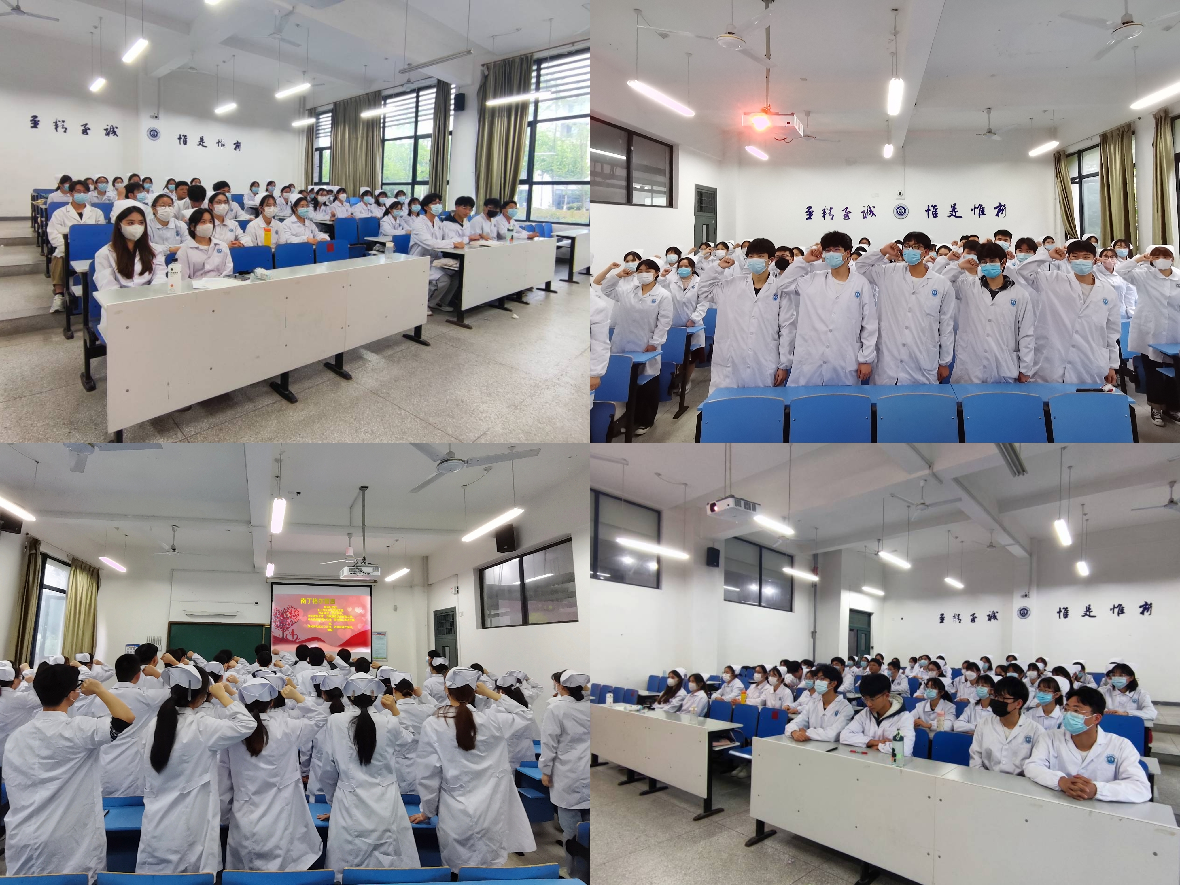 值此第111个国际护士节来临之际,为激励护院学子继承和弘扬南丁格尔不畏艰险、甘于奉献、救死扶伤、勇于献身的人道主义精神,各班级团支部纷纷开展重温护士誓词、观看中华护理学会国际护士节庆祝大会等活动。
