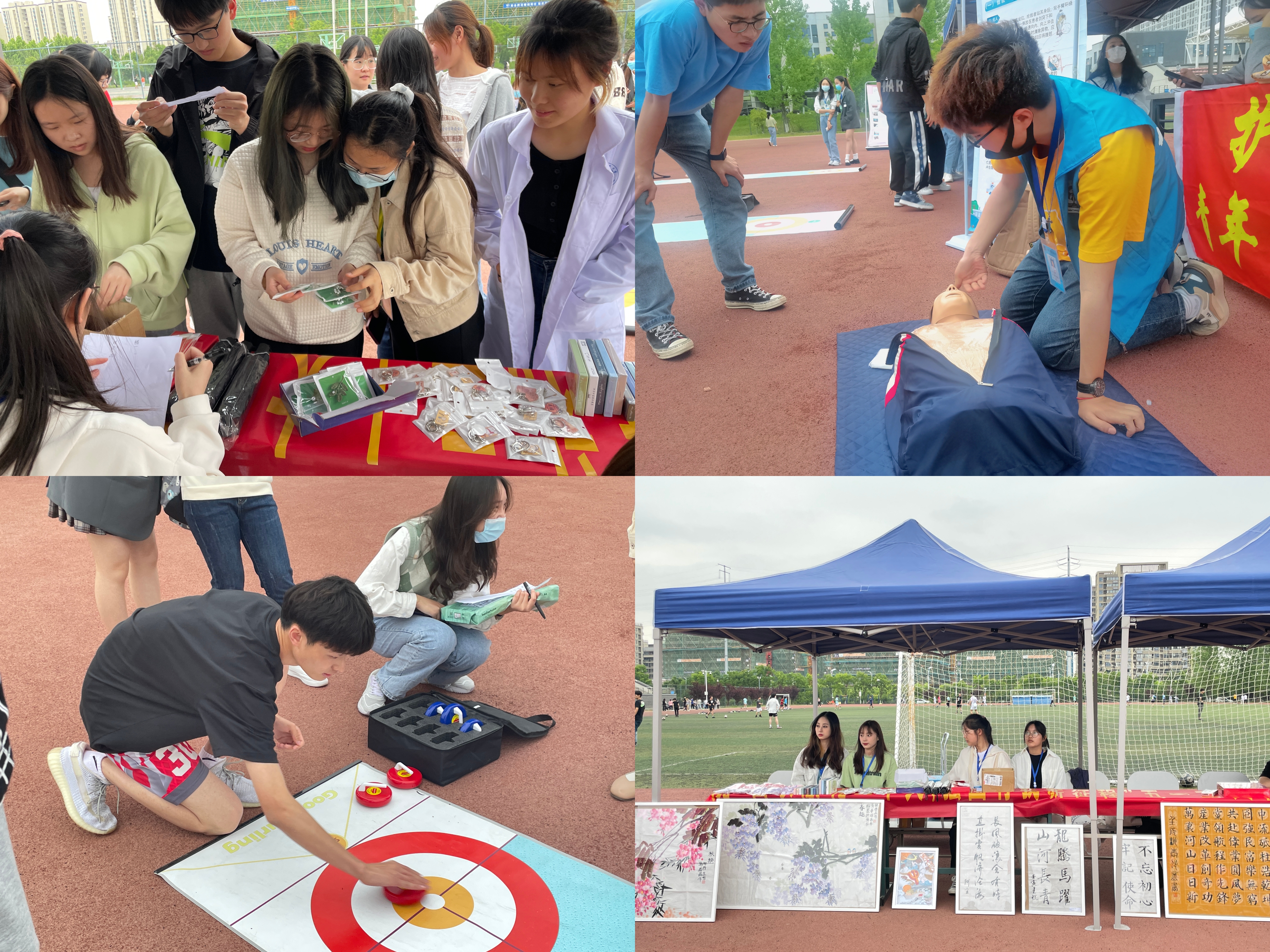 活动以k歌环节拉开帷幕,同学们用嘹亮的歌声、真挚的语言演绎时代乐章。游戏环节的到来使现场气氛更加高涨,游戏共分为两项,“冰壶掷奖挑战赛”中,同学们在冰雪文化中参与竞技,重温冬奥,弘扬精神;“医护知识知多少”环节中,同学们通过知识竞答的方式参与游戏,不仅收获了快乐,也习得了许多医护小知识。“喜迎二十大”签字环节将全场气氛推向顶峰,每位参与活动的同学都在横幅上留下“喜迎二十大”的字样。青春献礼二十大,强国有我,请党放心!最后,活动以书画展览和心肺复苏摆台介绍体验活动收尾,现场氛围十分热烈。