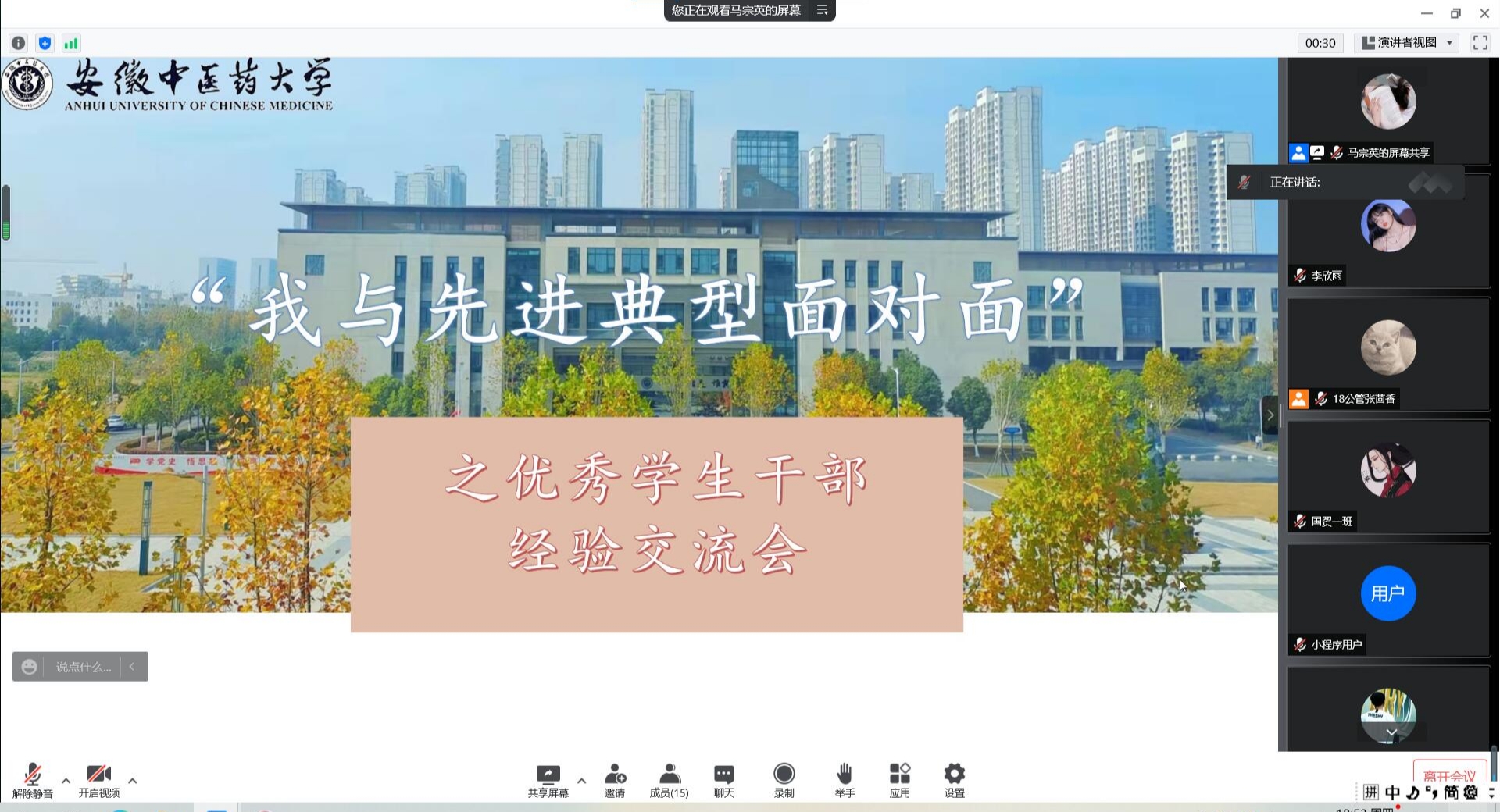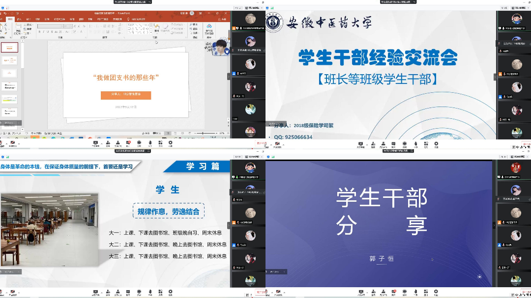 交流会上,三位学生骨干结合自身工作实际分别从不同角度进行了经验分享,司絮同学从学习生活、班级工作、班级管理和课外活动四个方面进行交流分享。郭子恒同学以学生会为中心,围绕着学生会“到底是什么?”“可以带来什么?”和“要付出什么?”三个问题展开自己对学生会干事经历的分享。张茴香同学从思想建设、社会实践与志愿服务和心得与体会三个方面来分享了自己在担任班级团支书的工作经历。