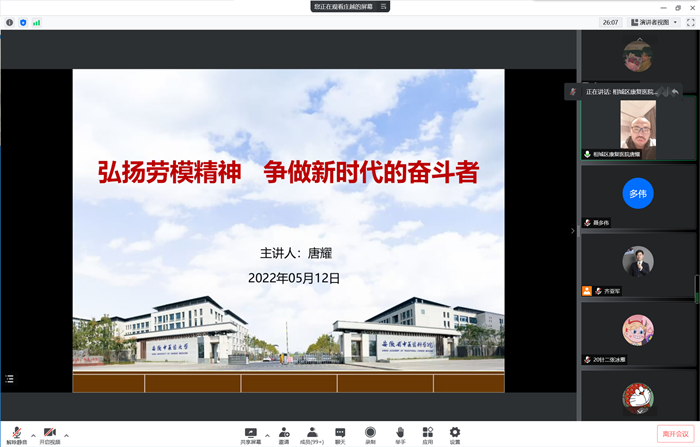 正值安徽省第2个“学生劳动宣传教育周”之际,为加强劳动教育宣传,弘扬伟大劳模精神,提升辅导员劳动工作斗志和奋斗精神,5月12日晚,针灸推拿学院通过线上形式开展“杏林匠心”辅导员工作室培训大讲堂,邀请苏州市相城区康复医院主治中医师、苏州市五一劳动奖章获得者、相城仁医,学院2011届杰出校友唐耀主讲,学院党政领导、全体专兼职辅导员和部分学生参会学习交流。