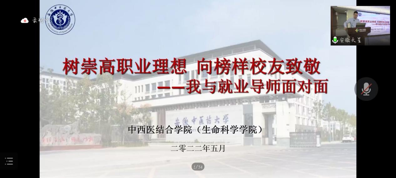 为帮助2022届毕业生搭建与招聘单位的联系渠道,同时也为在校生开展职业生涯教育,中西医结合学院于5月16日举办了“我与就业导师面对面”系列线上分享会。活动特邀98届中西医临床医学专业优秀校友、学校外聘就业导师、安徽天星医药集团有限公司总经理倪华安主讲,中西医结合学院辅导员老师和学生参加。