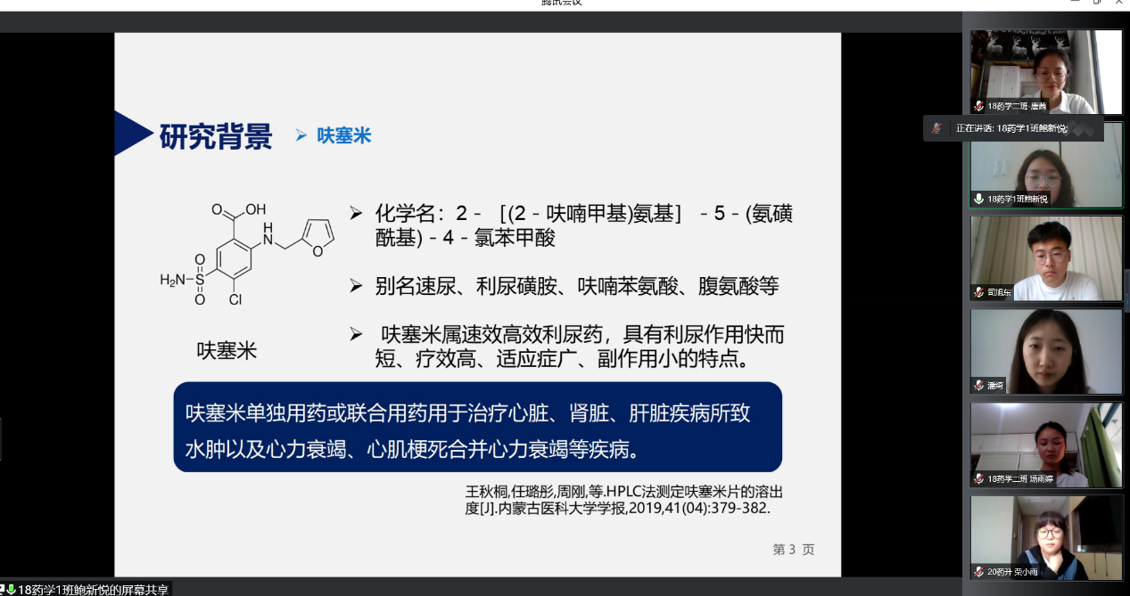 本科毕业论文是实践教学的重要组成,药学院历来重视本科毕业论文答辩工作。根据学校疫情防控政策要求,5月18日、5月20日,药学院分批次开展2022届线上本科毕业论文答辩工作,中药学、药学(含专升本)、药物制剂、制药工程、生物制药、食品质量与安全6个本科专业526名同学参加。根据研究领域分为生产、营销、药物制剂、食品与生物制药、药物分析、药理学、药物化学、天然药物化学、中药学、医院药学10个方向,共计44组。由安徽医科大学第一附属医院、安徽省立医院、安徽中医药大学第一附属医院相关专家及校内老师共120余人组成专家组。