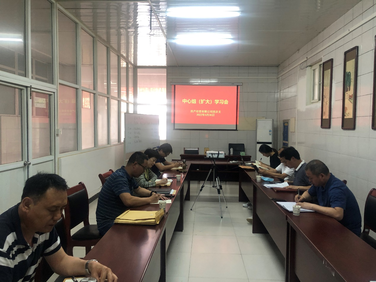 5月30日下午,资产经营有限公司在西区史河路会议室召开2022年第8次党总支中心组(扩大)学习会。会议由公司党总支书记张亚辉主持,党总支委员、副总经理、职能部门负责人参加了本次学习会。