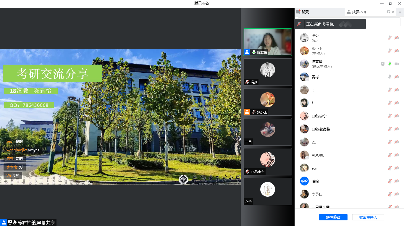 本次考研经验交流会邀请了张小玉、陈君怡、高雅、陈宇宁和王莉等同学,几位2022届考研上岸的学姐结合自身考研经验及保送的心路历程,为学弟学妹考研提供建议,鼓励学弟学妹们理性审视自己的能力与水平,结合实际情况和课程专业合理选择,争取一战成功,不负青春韶华。互动环节中,学姐们对同学们提出的考研问题和困惑、学习安排与复习计划等逐一耐心解答。