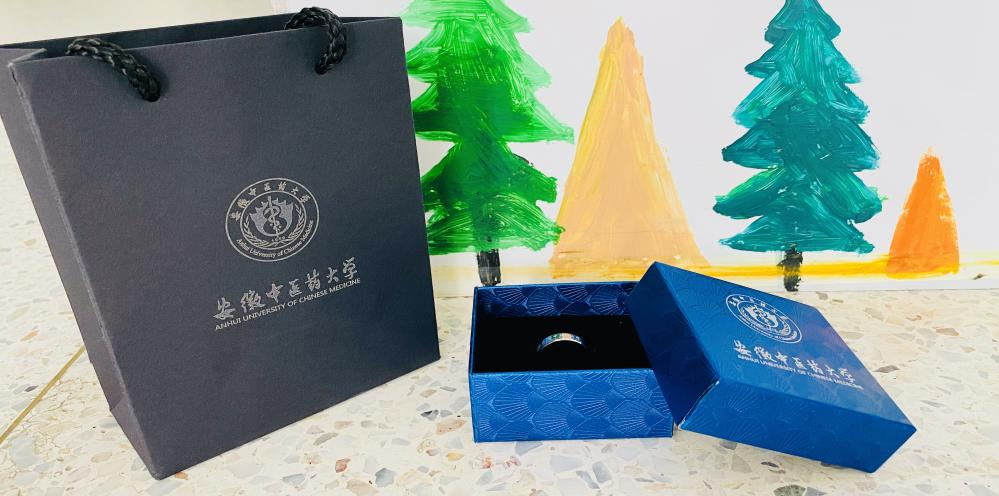 戒指的全身由钛钢打造,戒指外环印着安徽中医药大学的校徽和校名,戒指内环上雕刻着的学生的姓名和班级。大学时光如沙漏一般在指尖流逝,将姓名和学号镌刻在戒指上,让每一枚戒指都成为唯一,与药学院一起,勾勒出与母校独一无二的青春记忆,小小的戒指也承载了药苑的祝福:前途似海,来日方长,愿世间的美好与你环环相扣。