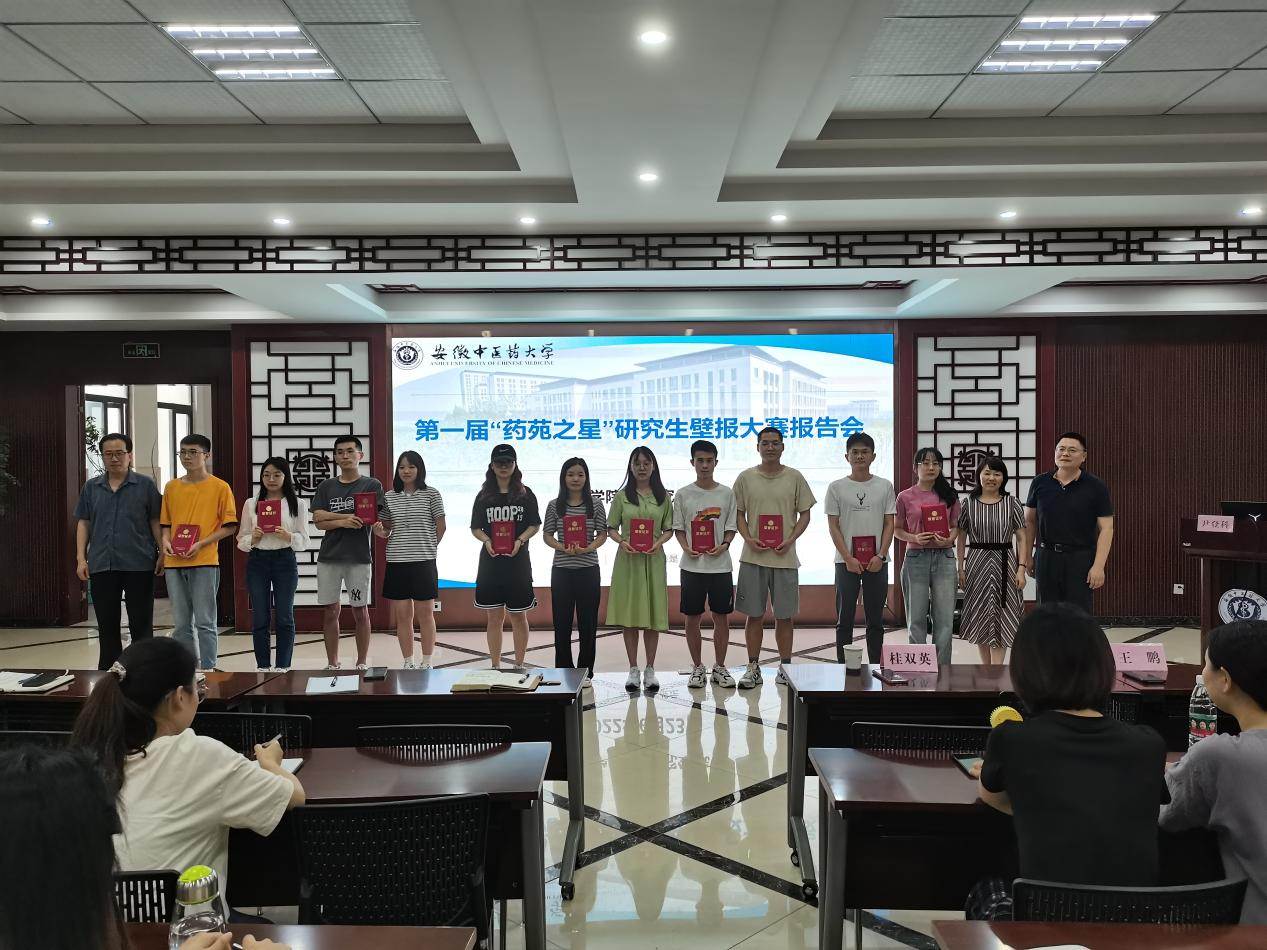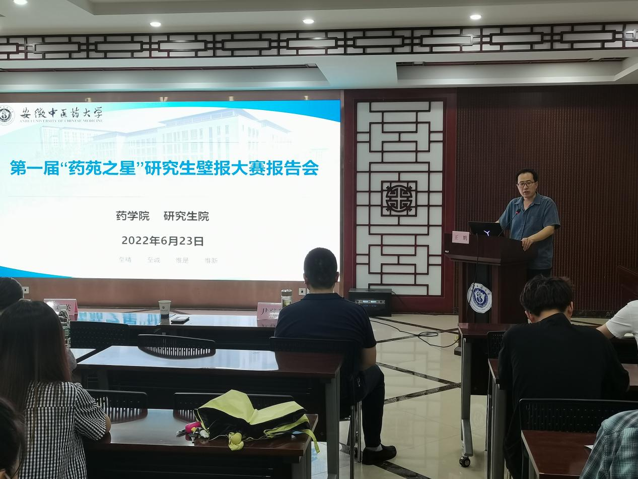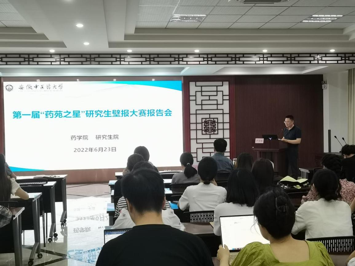 6月23日下午,安徽中医药大学第一届“药苑之星”研究生壁报大赛报告会在少荃湖校区沁馨堂成功举办。研究生院院长王鹏、药学院院长桂双英、药学院副院长尹登科莅临现场指导。