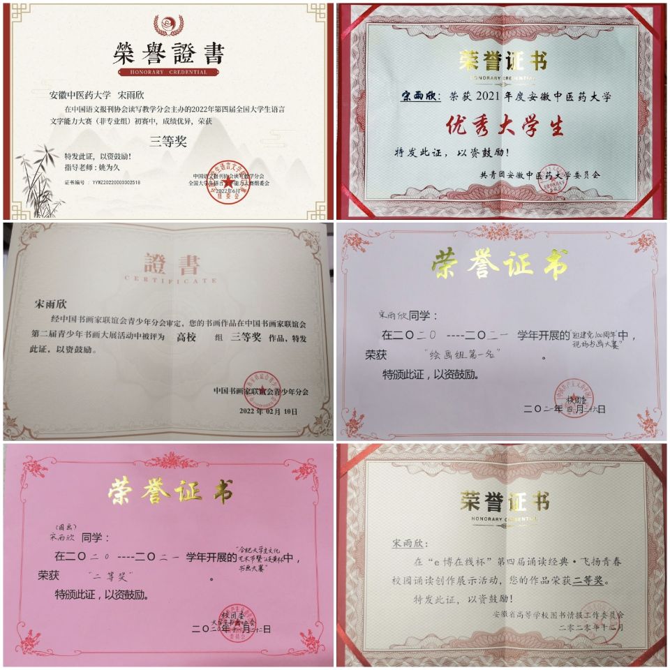 宋雨欣,中共党员,2019级汉语国际教育班,已考取高中语文教师资格证,曾获校级一等奖学金、一方奖学金,主持国家级大学创新创业项目1项,发表学术论文1篇,连续两学年获得安徽中医药大学“优秀团员”称号,安徽中医药大学2021年度“优秀大学生”,曾担任安徽中医药大学第36届大学生书画协会副会长、绘画俱乐部总负责人以及人文与国际教育交流学院安全委员。2019年加入合肥市志愿者联合会以来,积极各级各类社会实践和志愿服务。