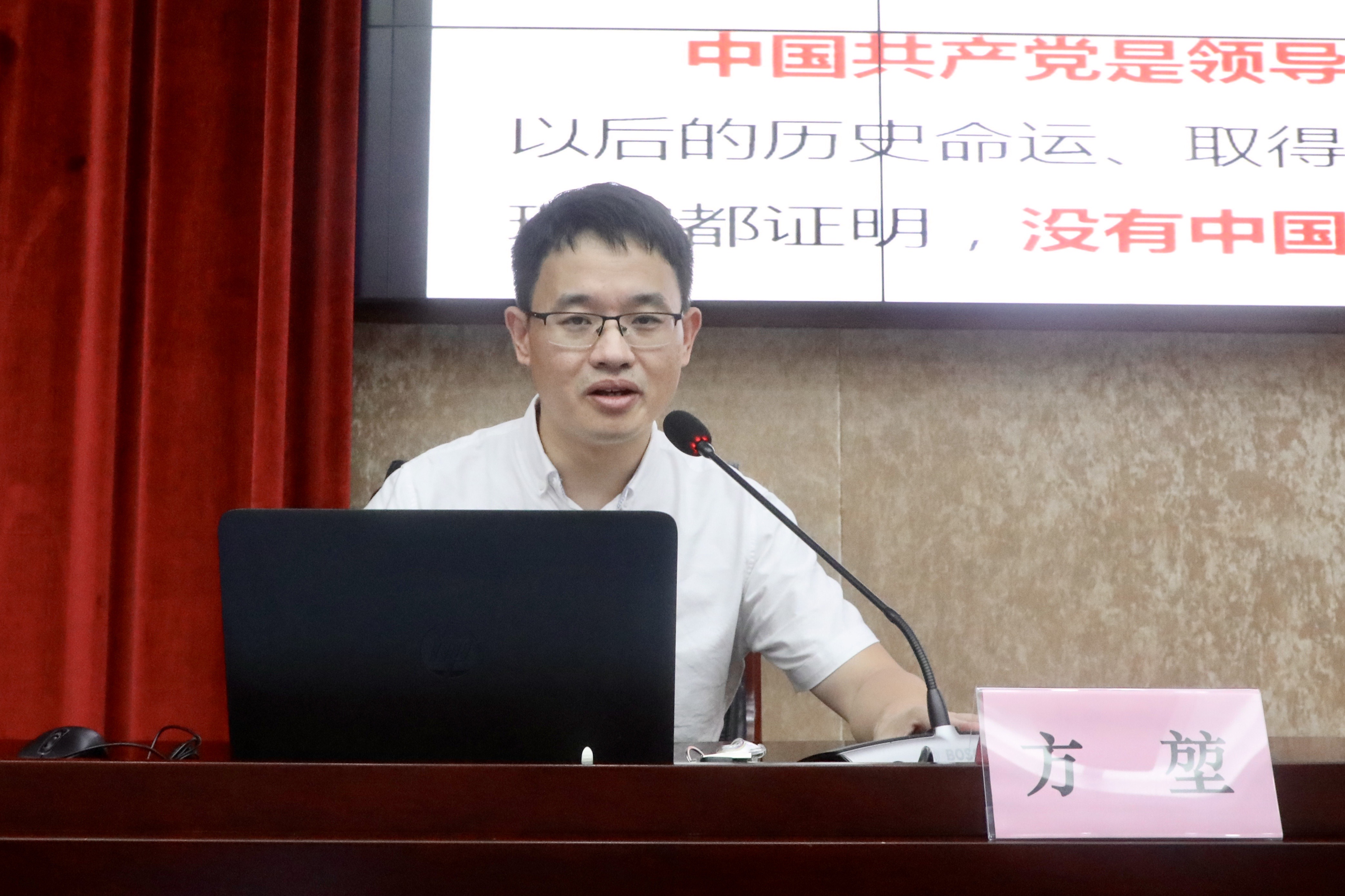 安徽省委党校副教授方堃作题为《坚持和加强党的全面领导》专题讲座。他从坚持党的领导的历史源流、党的领导在中国的百年探索、新时代坚持党的全面领导三个方面,从理论维度系统分析阐述了实现中华民族伟大复兴为什么必须坚持党的领导、从历史维度考察党的领导的历史演进,进而论证新时代坚持党的全面领导的科学内涵、从现实维度结合习近平总书记关于党的领导重要论述,阐释新时代该如何坚持和完善党的全面领导。他生动形象地讲解了在新民主主义时期、社会主义革命和建设时期、改革开放和社会主义现代化建设时期、新时代中国特色社会主义时期党的领导的特点,鲜活易懂地阐述了党是领导一切的,是最高政治领导力量。