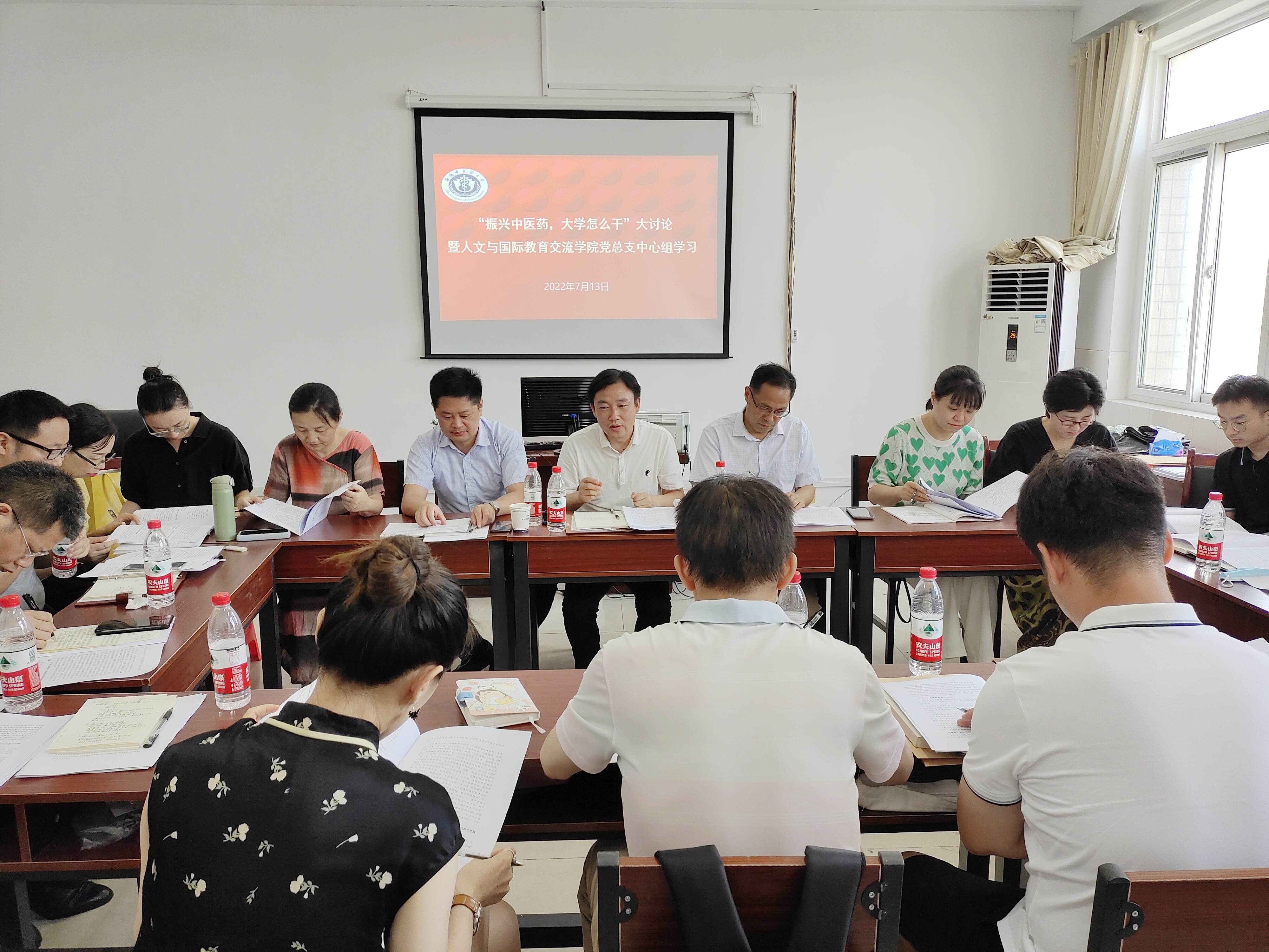 为贯彻落实学校党委书记王琦在“振兴中医药,大学怎么干”大讨论、大谋划、大行动动员部署会上的讲话精神及学校党委的有关工作部署、具体要求。7月13日上午,人文与国际教育交流学院召开“振兴中医药,大学怎么干”大讨论暨党总支中心组学习会。学院党政领导、党总支委员、各支部书记、各系(中心)主任和各行政科室负责人参加会议。会议由学院党总支书记姚为久主持。