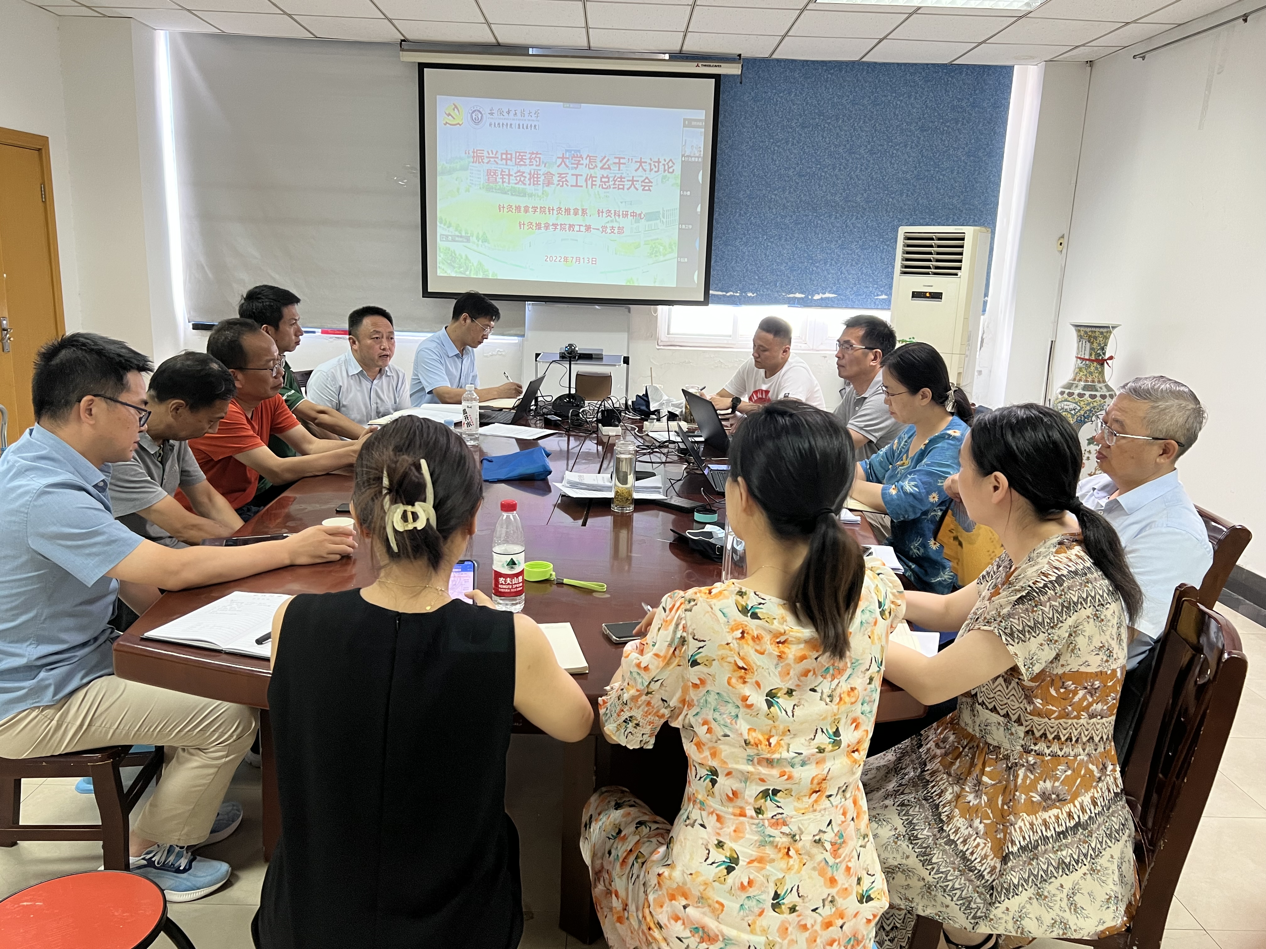 7月13日下午,为有效落实学校、学院党委关于“振兴中医药,大学怎么干”大讨论、大谋划、大行动的工作方案要求,率先在基层开展大讨论,针灸推拿系、针推科研中心召开“‘振兴中医药,大学怎么干?’暨针灸推拿系工作总结大会”。学院党委书记蒋宏杰,院长唐巍,副院长刘自兵、吴子建,康复养生系主任陈朝晖,实验实训中心主任姚长风,针灸推拿系全体教师参加会议,会议采取线上线下结合的方式进行。