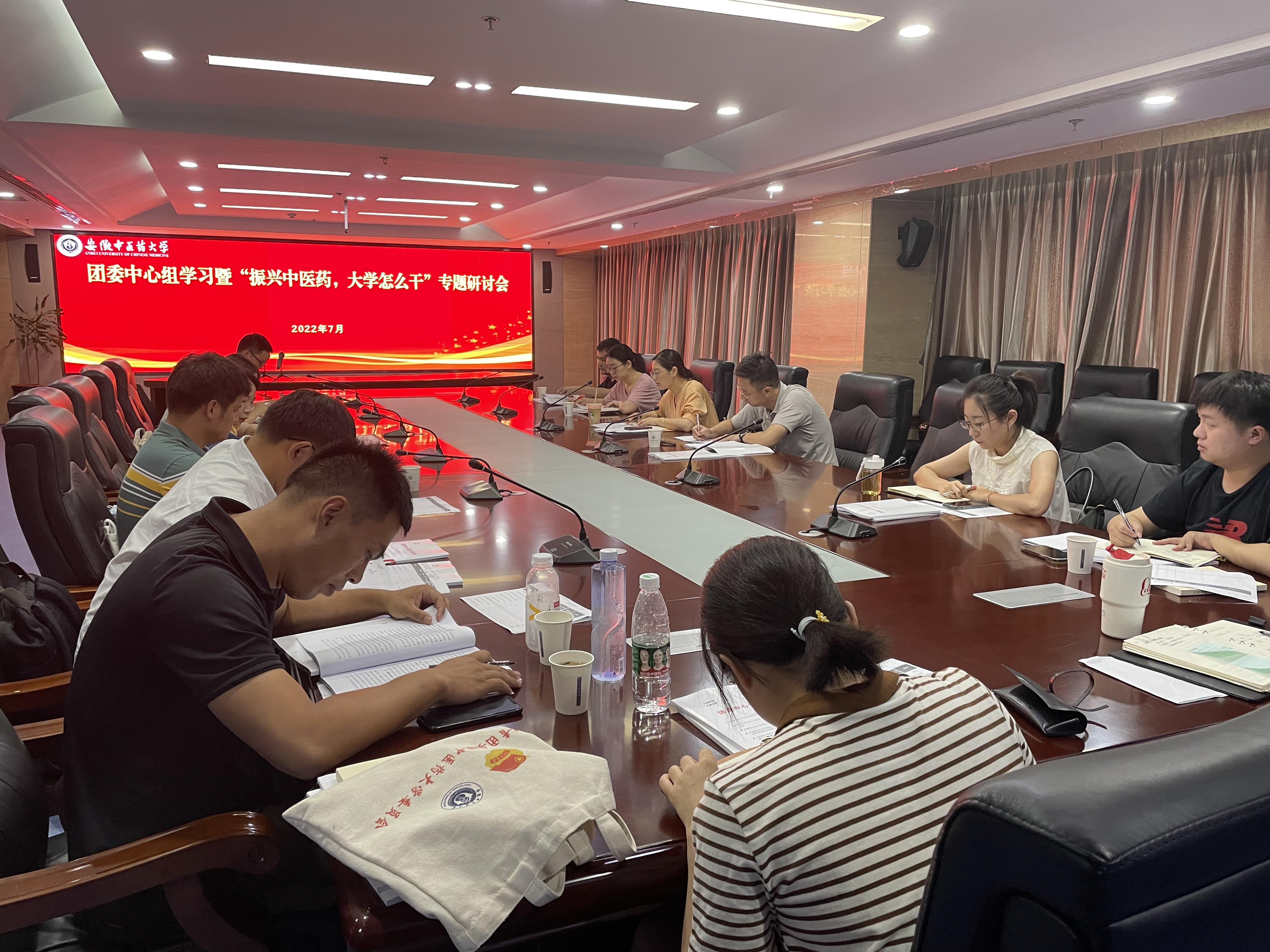 7月15日下午,学校团委中心组召开理论学习会,并就“‘振兴中医药,大学怎么干’大讨论、大谋划、大行动”进行动员部署和专题研讨。校团委全体成员、各学院分团委负责人参加会议。