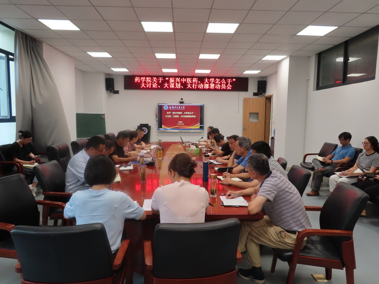 7月18日上午,药学院在少荃湖校区召开“振兴中医药,大学怎么干”大讨论、大谋划、大行动部署动员会。学院党政班子成员、学术委员会委员、各系(中心)主任和副主任和教学督导参加会议。会议由药学院党委书记胡卿主持,采取线上线下结合的方式进行。