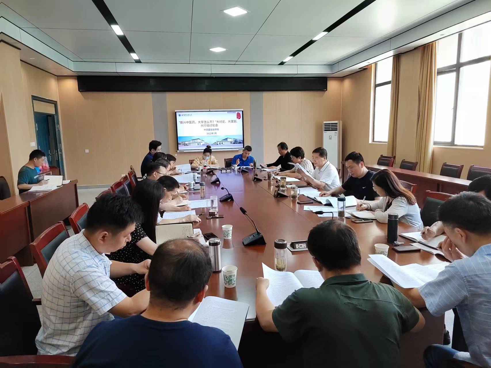 为深入贯彻学校党委书记王琦在学校“‘振兴中医药,大学怎么干’大讨论、大谋划、大行动”动员部署会上的讲话精神及学校党委《“振兴中医药,大学怎么干”大讨论、大谋划、大行动工作方案》的工作部署,7月19日下午,中西医结合学院在B8楼216会议室召开专题研讨会,学院党委委员、党支部书记、教研室主任、行政科室秘书、部分教师代表参加此次研讨会。会议由学院党委书记尹必武主持。