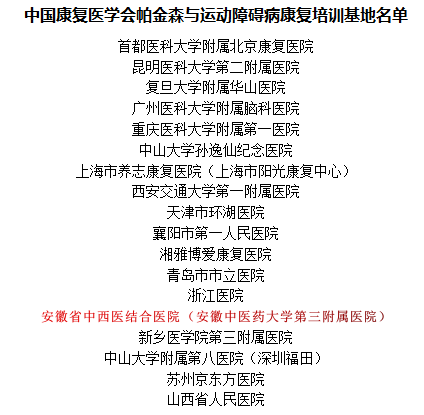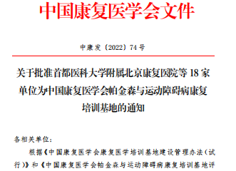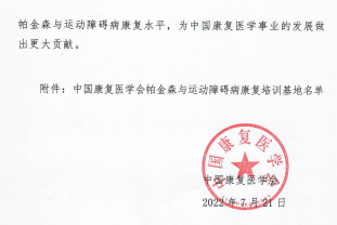 7月21日,中国康复医学会根据《中国康复医学会康复医学培训基地建设管理办法(试行)》和《中国康复医学会帕金森与运动障碍病康复培训基地评审标准》,经过专家严格评审,公布评审结果,最终审定18家医疗单位作为首批“中国康复医学会帕金森与运动障碍病康复培训基地”,第三临床医学院成功上榜,并将被授予牌扁与证书。
