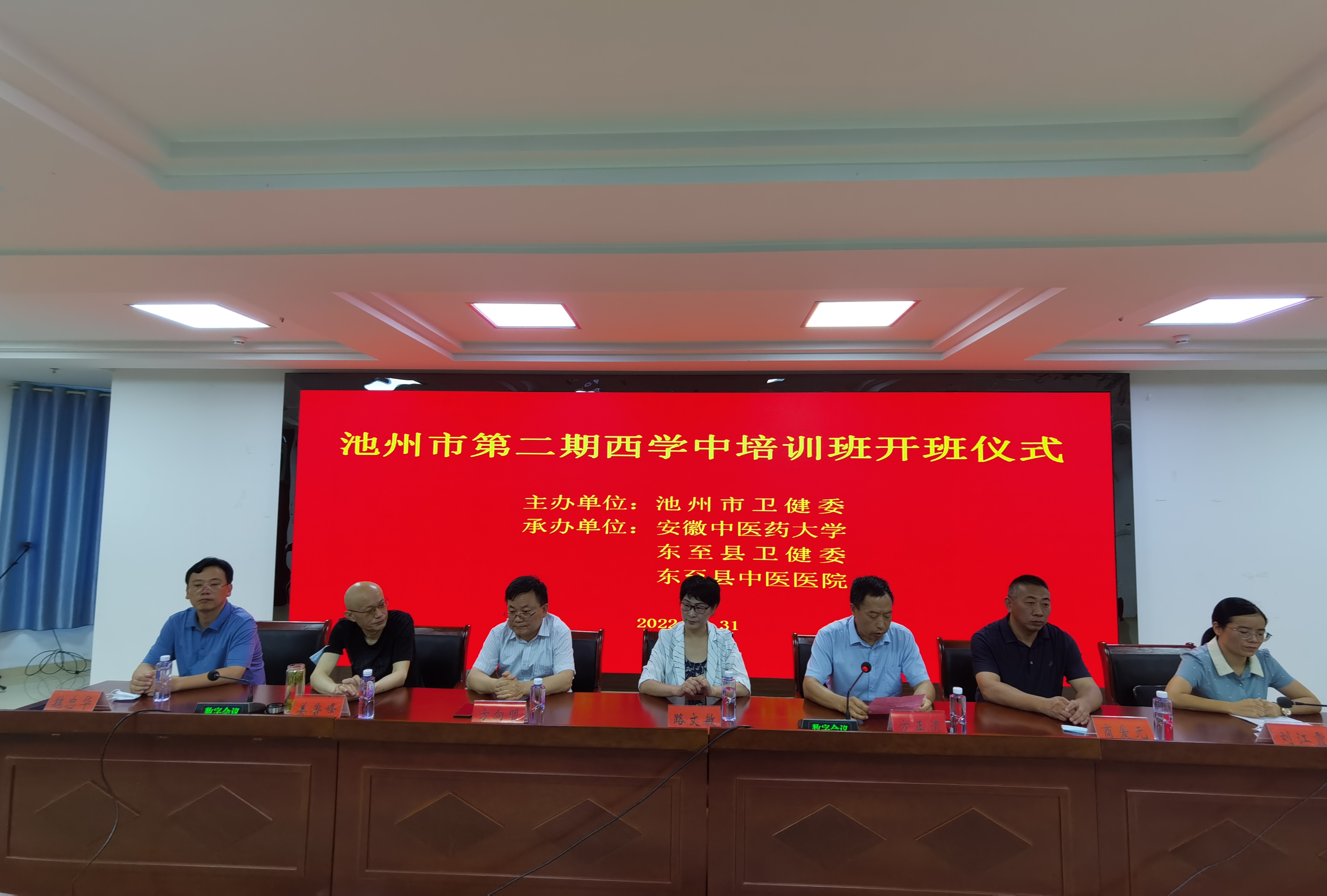 7月31日,池州市第二期“西学中”培训班在东至县中医医院举行开班仪式。池州市卫生健康委副主任路文敏,我校继续教育学院院长方正清、中医学院院长方向明,东至县卫生健康委主任商爱元、党组成员刘江霞,东至县总医院党委书记姜鲁峰,东至县中医医院院长魏忠华出席开班典礼。来自东至县各级各类医疗卫生机构的43名西医师,学校继续教育学院、中医学院相关人员参加了开班仪式。刘江霞主持开班仪式。