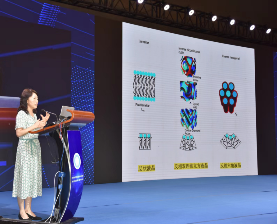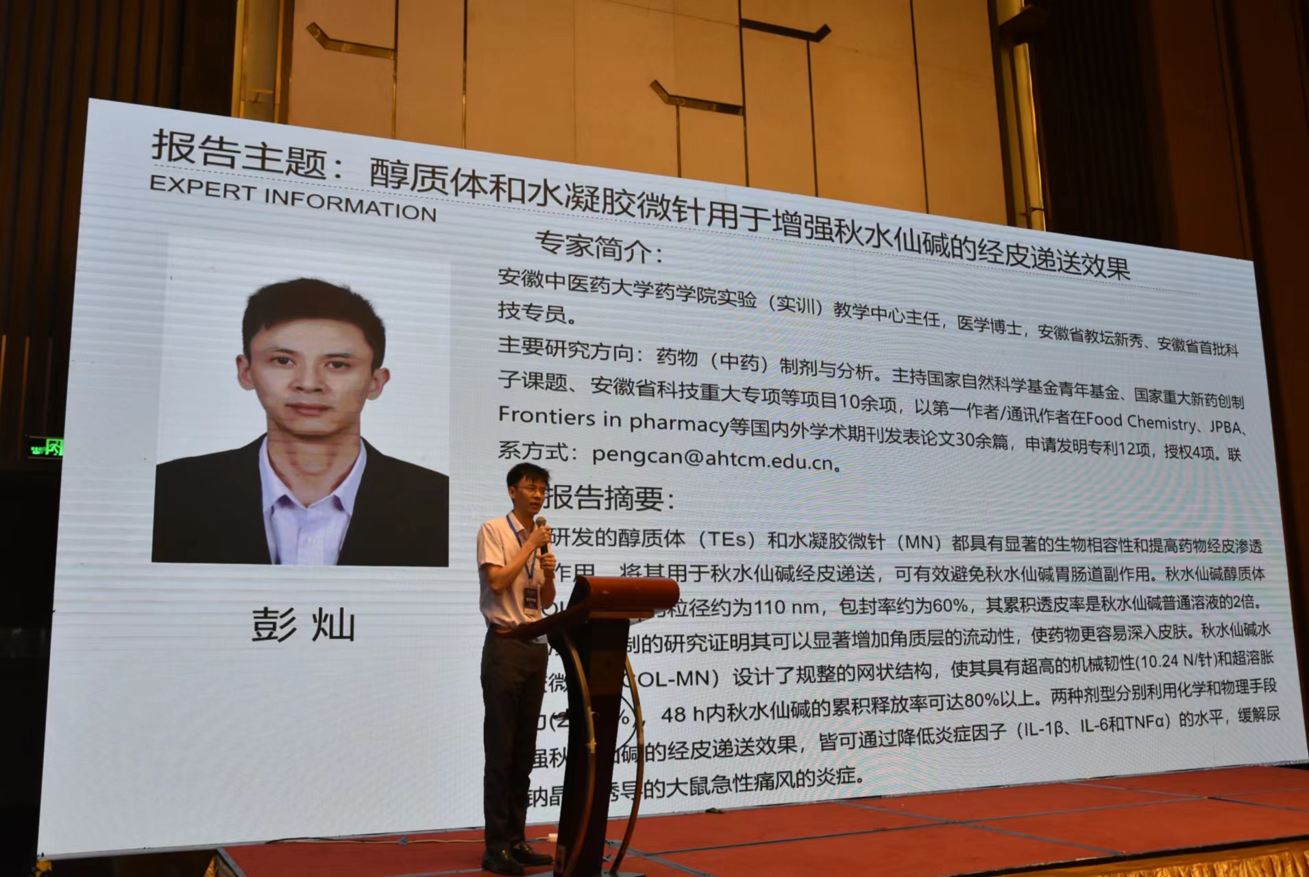 经皮给药制剂是药物制剂技术与应用安徽省重点实验室的科研方向之一。桂双英作了题为《中药双组分溶致液晶透皮给药系统的构建与评价》的大会报告,系统介绍了溶致液晶在中药双组分经皮给药系统的应用思路,并分享了研究团队关于立方相液晶与六角相液晶的载药、透皮性能的最新研究进展。重点实验室秘书彭灿副教授在“青年论坛会场”以《醇传递体和水凝胶微针用于增强秋水仙碱的经皮递送效果》为题,汇报了应用醇传递体和水凝胶微针促进亲水性药物秋水仙碱的透皮吸收,提高痛风的治疗效果并能降低药物副作用的研究成果。两场报告均引起了较好的学术反响。